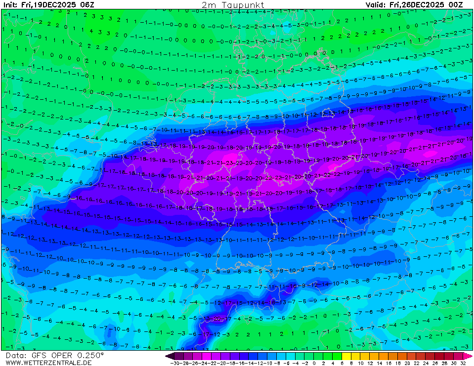 In delen van Duitsland zelfs richting de -25! Later dreigt een aanlandige component zoals te zien aan het dauwpunt in het noorden. Echter nog steeds onder nul. Sneeuwkansen evt. als lagedrukinvloeden zich ons weet te bereiken?