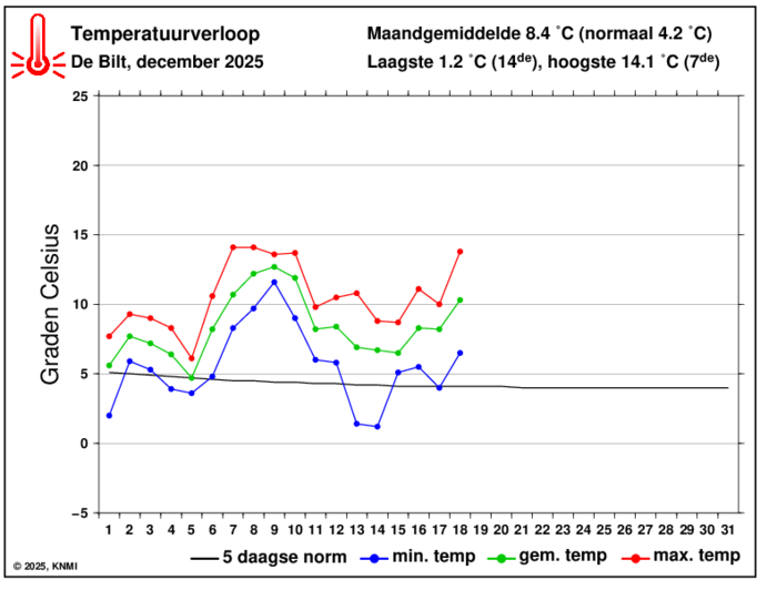 zou komen. De Bilt tot en met 18 december ruim 4 graden te warm/ zacht. Mocht die omslag plaatsvinden hoe bijzonder is dat binnen dezelfde kalendermaand. Immers in de Bilt nog geen vorst in december tot nu toe... lijkt wellicht op het spel alles of niets...