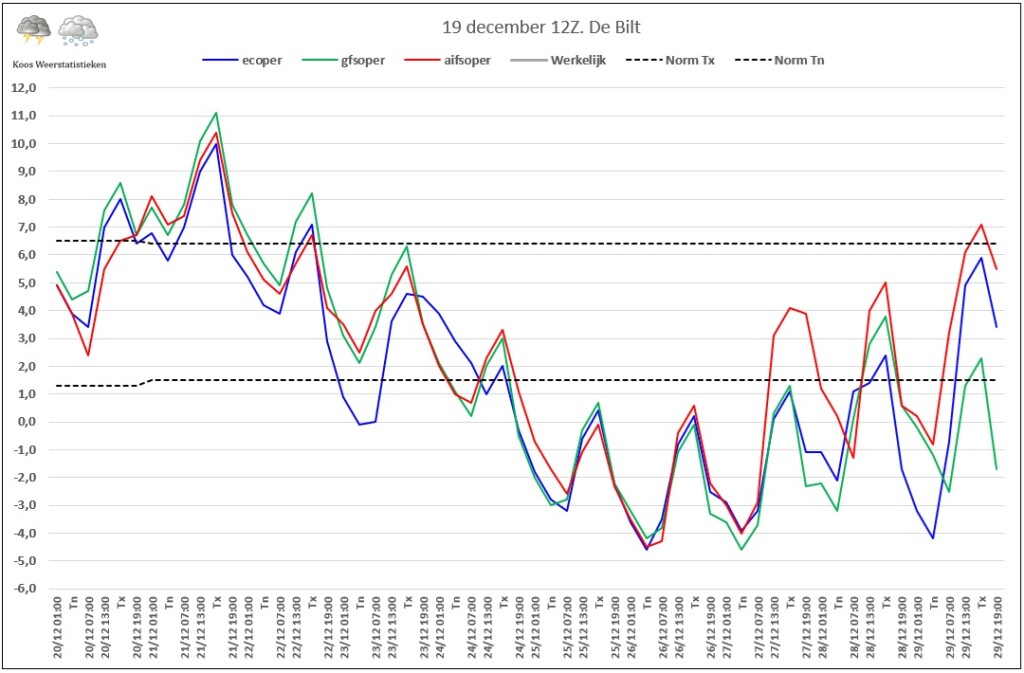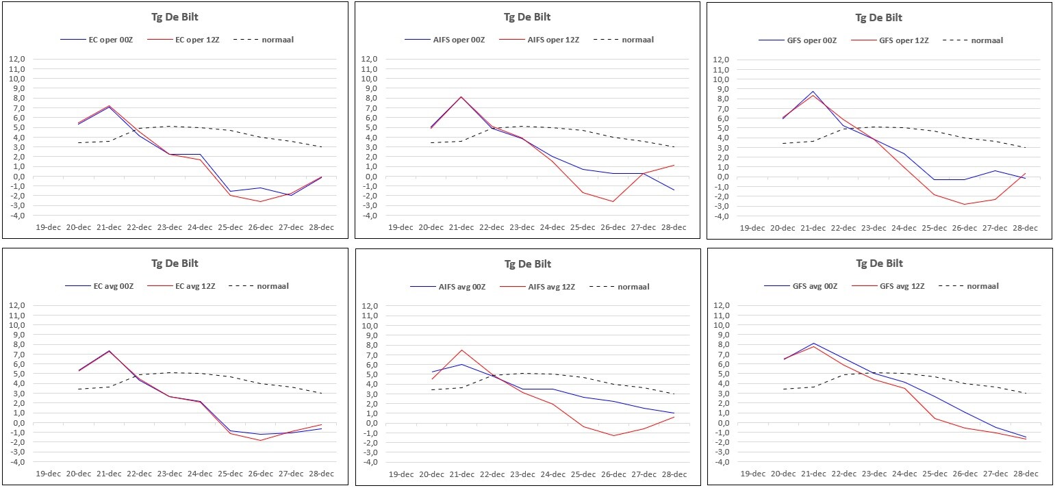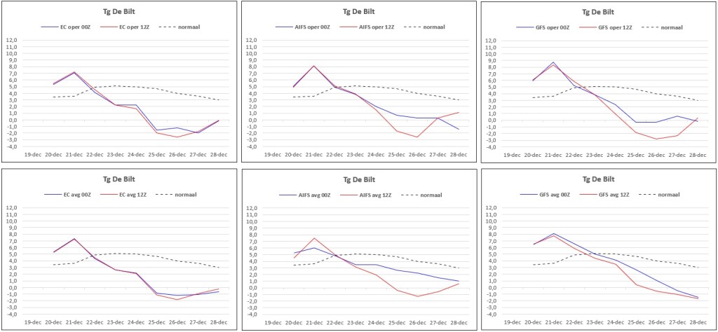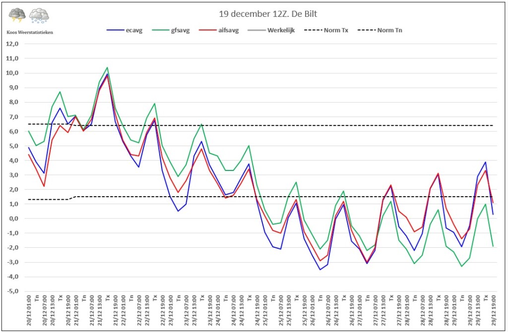 Je ziet dat de modellen steeds meer naar elkaar toetrekken qua gemiddeldes voor de periode rond kerst.