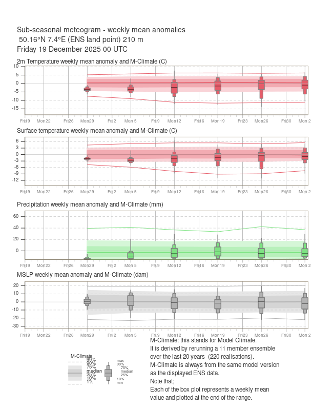 Het Meteogram voor West-Duitsland laat dit ook mooi zien bijvoorbeeld. Volgens de modelklimatologie voor 19-26 januari zijn de 10% warmste afwijkingen ca. +4.5°C en de 10% koudste ca. -5°C. In het huidige ensemble gaat het 90e percentiel naar +4°C en het 10e percentiel naar -9°C (nogmaals, allemaal afwijkingen t.o.v. de norm). Dat betekent dat de onzekerheid/range in het huidige ensemble (13 graden voor de middelste 80%) groter is dan voor de modelklimatologie (80% middelste oplossingen binnen 9 à 10 graden).