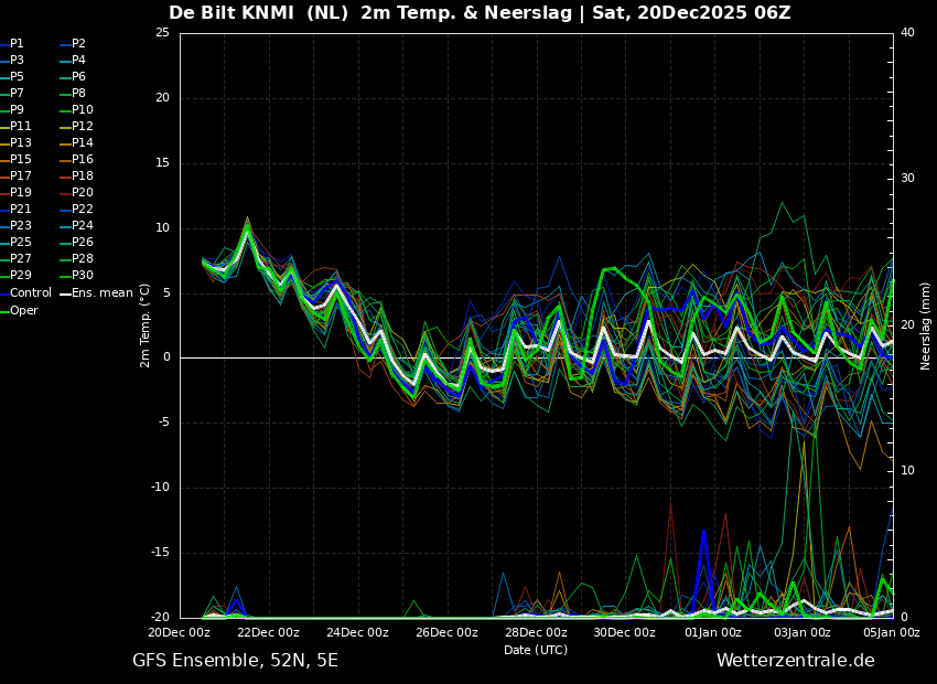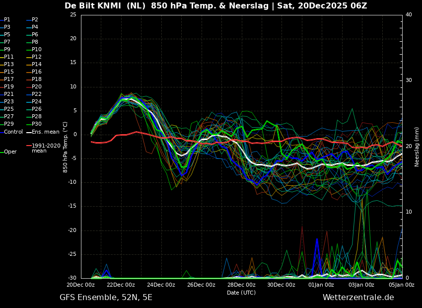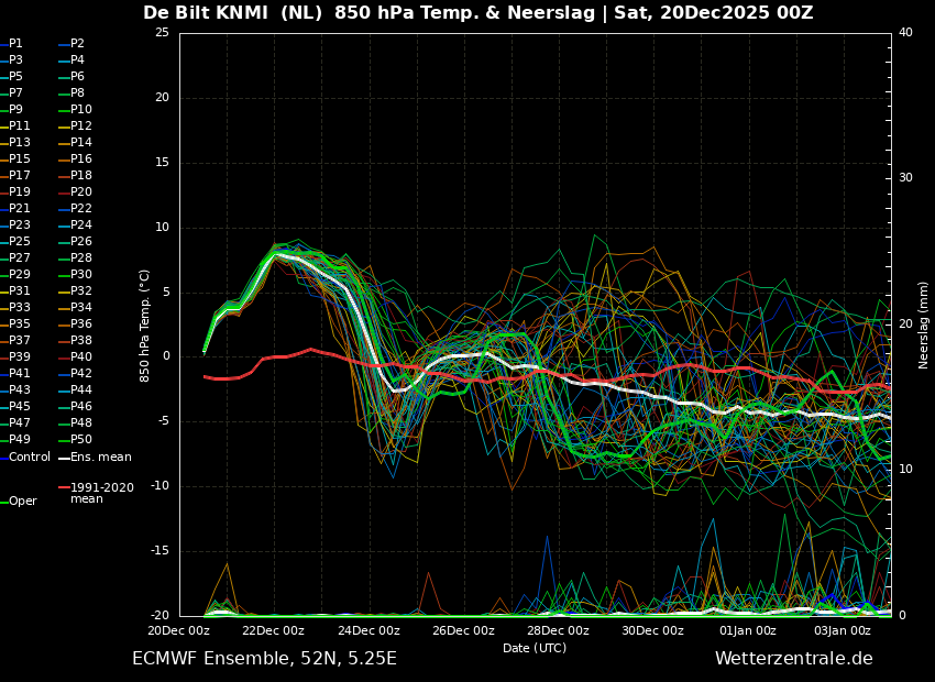 Overigens, de 850hPa pluim van EC00z laat ook wel zien hoe gigantisch de onzekerheid is richting Oud en Nieuw met een enorme spreiding en daarna net als bij GFS gemiddeld onder het langjarig gemiddelde.