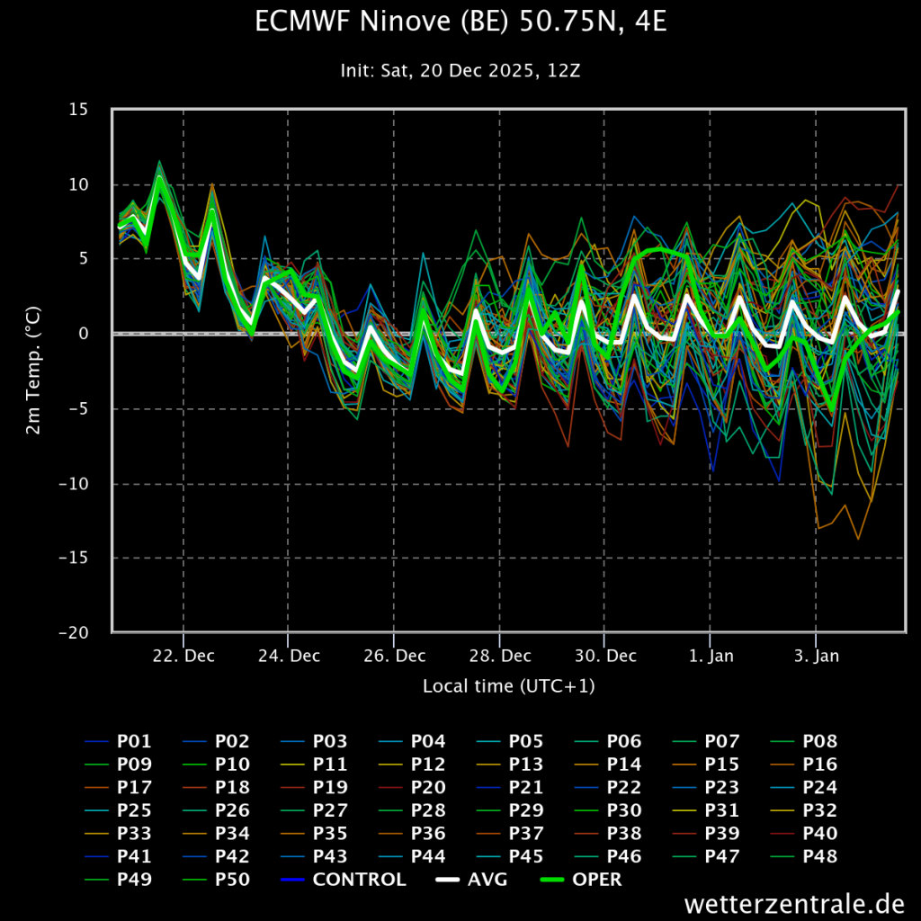 Ziet er ook nog altijd oke uit. Afgaande op de zuidelijke pluimen lijkt het daar na volgend weekend, tijdens de eventuele tijdelijke mindere koude fase, nog mee te vallen. Ook hier is de oper tijdens de laaste 2 dagen van 2025 een "zachte" uitbijter.