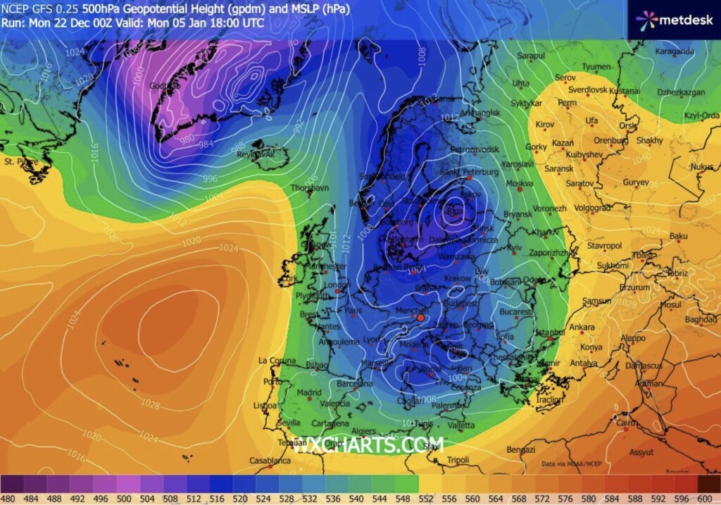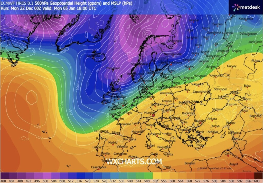 Er is niet echt een bespreking verder nog van EC00z, dus dan maar even een kleine vergelijkingspost. Op de LT, daar waar GFS al meerdere runs in het nieuwe jaar met een koude uitzakkende trog komt, komt EC00z deze oper run met een hoog dat platgewalst wordt op de oceaan en een soort van WC variant met een zuidwestelijke stroming.