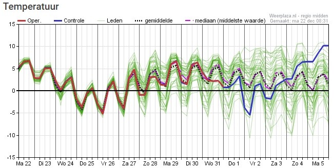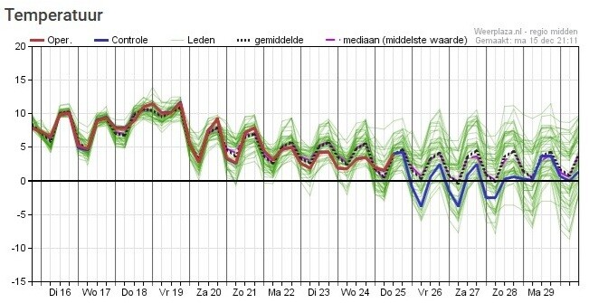 Voor dag 6 vanaf nu zie je al een grote spreiding op 27 december. Gemiddeld over alle pluimen zie je dan normaal een kleinere spreiding. Daarna neemt de spreiding alleen maar toe.