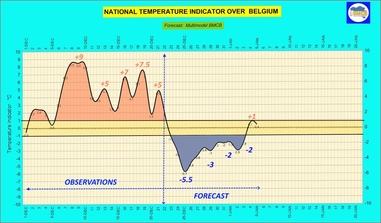 Het nationale temperatuursignaal heeft inmiddels duidelijk de neerwaartse trend ingezet. Tegen Kerstdag zal de index naar verwachting dalen tot –5 à –6, wat in heel België zal zorgen voor een uitgesproken winterse sfeer. De maximumtemperaturen zullen dan tussen –4 en +2°C schommelen, afhankelijk van de regio, met algemene nachtelijke en ochtendvorst.