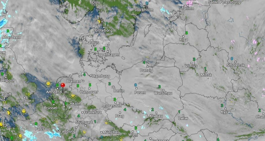 Als ik naar de satellietfoto kijk, dan zie ik ten oosten van de Benelux een nagenoeg gesloten pakket met lage bewolking klaarliggen van honderden, zo niet duizenden vierkante kilometers dat onze kant op komt. Natuurlijk, het kan wegtrekken, openbreken en door subsidentie oplossen. Laten we hopen dat de diverse weercomputers correct hebben berekend dat dit gaat gebeuren in de loop van de komende twee dagen.