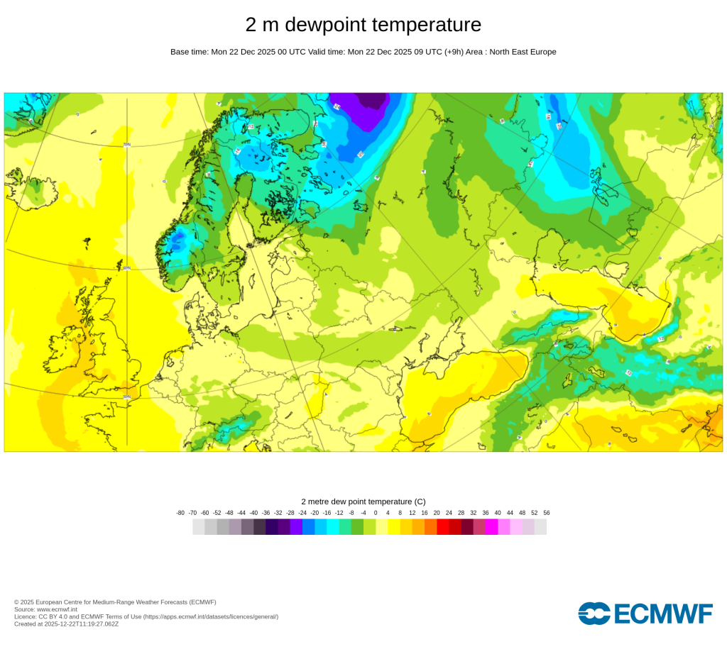 De luchtsoort waar we met Kerst in terecht komen ligt nu nog boven Lapland en het noordwesten van Rusland. Niet zozeer boven Oost-Europa. Daar in het verre noordoosten zitten nu dan ook de opklaringen.