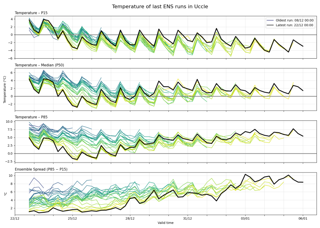 De dagen rond Kerst zijn de laatste runs wat kouder geworden, maar daarna juist zachter. Ik vond dit visueel vrij duidelijk door voorgaande meteogrammen naast elkaar te bekijken, maar ik heb het voor de duidelijkheid op 1 plot gezet (voor Brussel) :