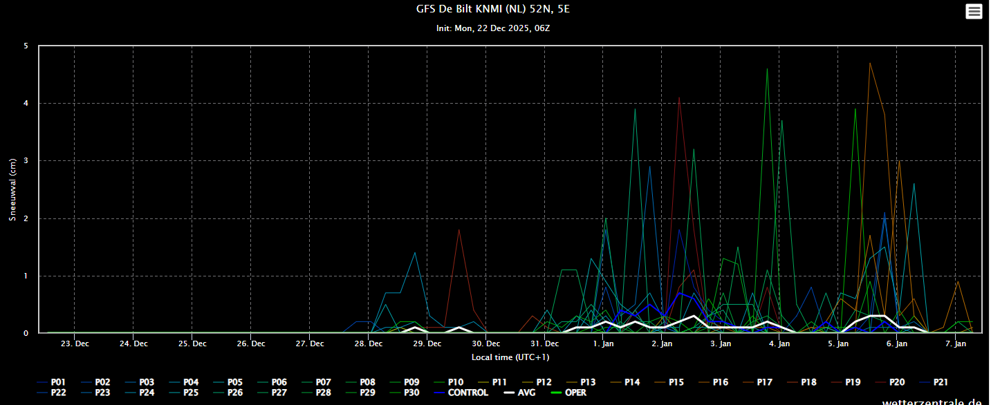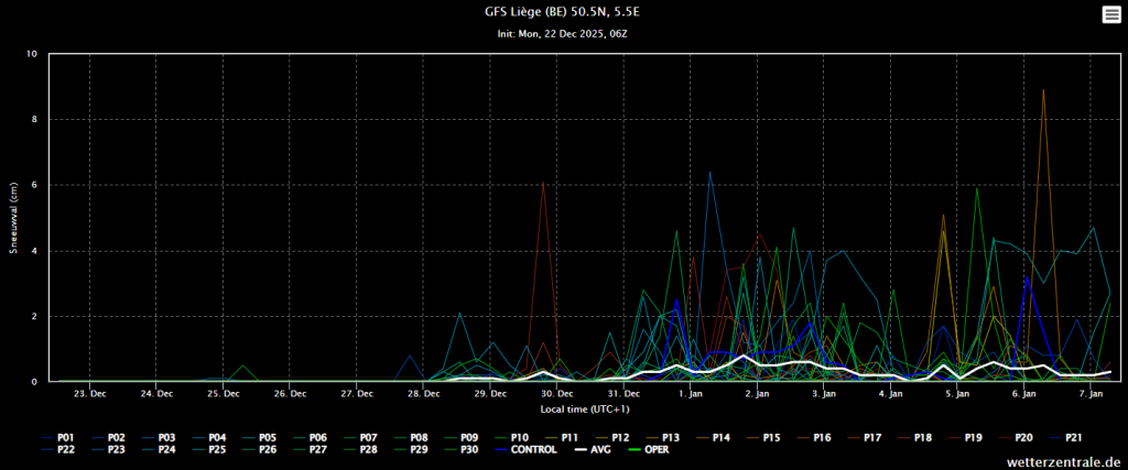 In de aanlandige noord- tot noordweststroming op termijn zijn thermische excessen niet waarschijnlijk, maar wel nemen de sneeuwkansen toe. Ik plaats ook die van Luik, verder landinwaarts en wat meer op hoogte gaat het in het nieuwe jaar vrij zeker interessant worden.