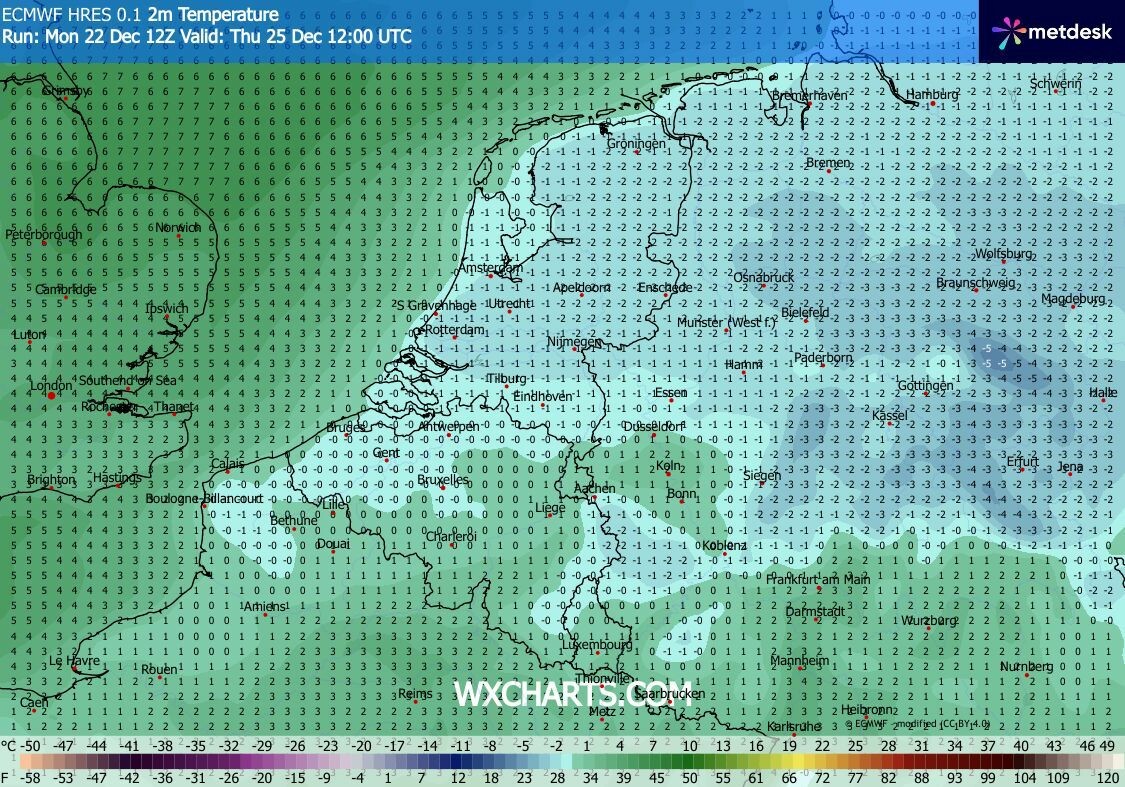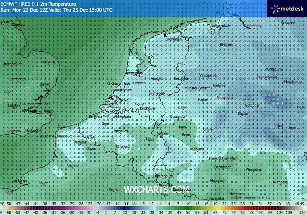 Uiteindelijk als je bv naar de opers van AIFS/UKMO kijkt, is er ook een optie dat het koud blijft tem volgende week maandag of zelfs langer bij AIFS. Eerst maar eens genieten van de koude en zonnige kerstdagen. En op de KT is de kans op een ijsdag in Ukkel terug in deze run, waar die de voorgaande runs wat verdween, al zal het nipt zijn.