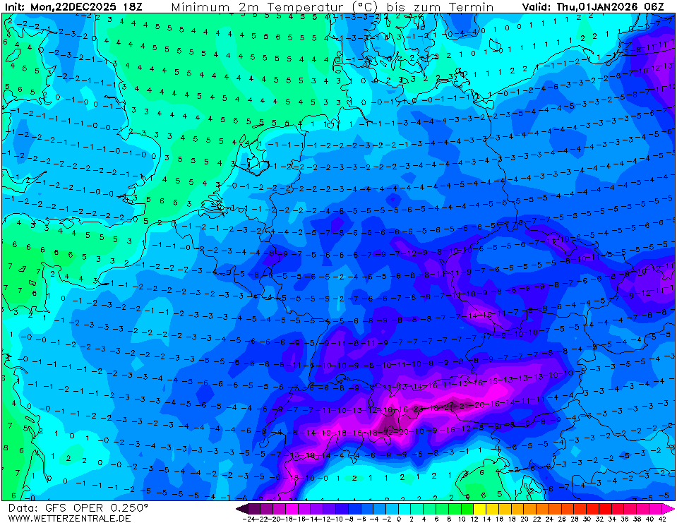 GFS 18Z. Dauwpunt kerstnacht tegen -18 °C in het oosten.