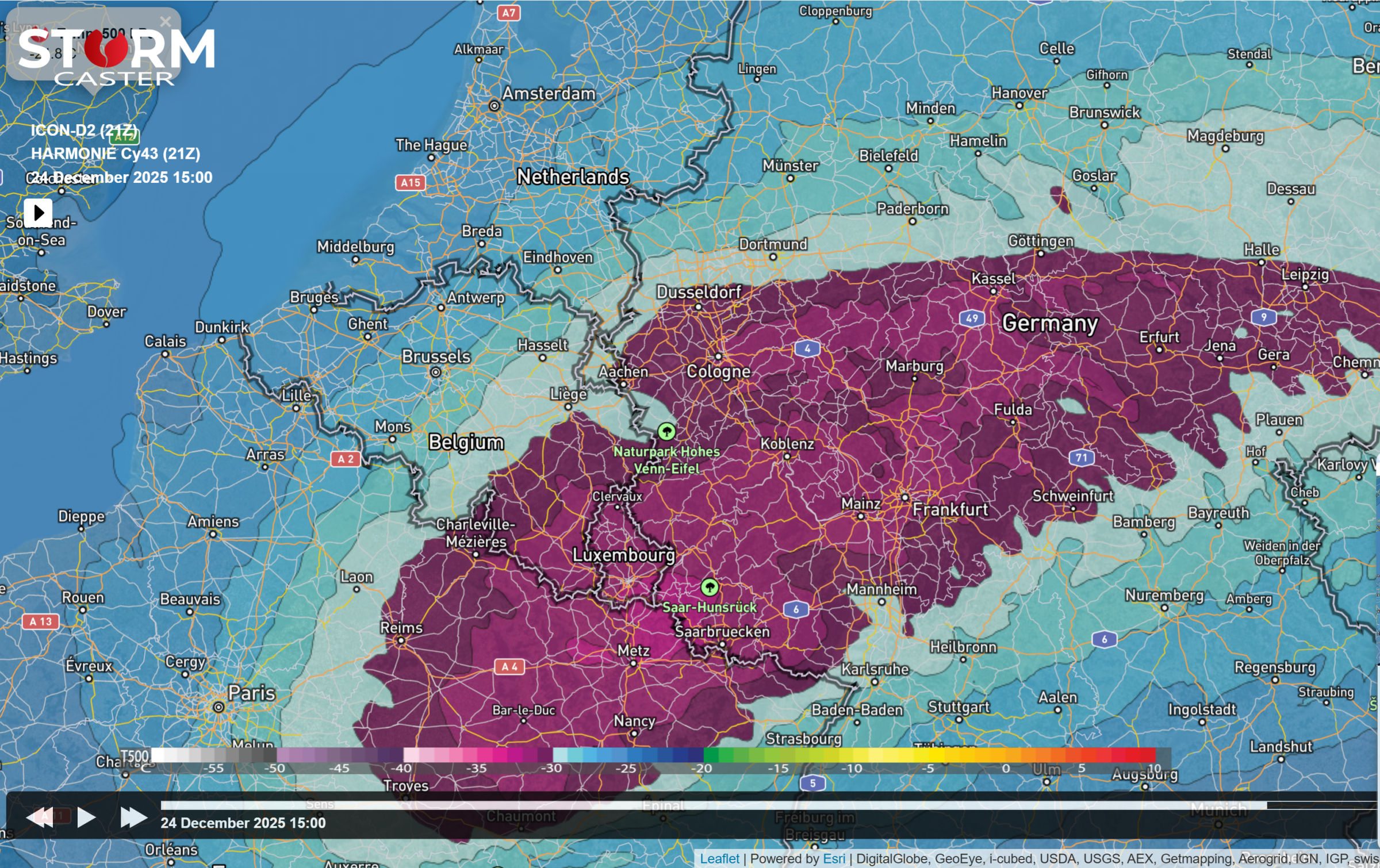Ik zat zojuist een beetje met StormCaster (https://scsptqi2023.stormcaster.eu/) te spelen en ik vind het toch wel leuk om te zien om de komende 'winterprik' in de weermodellen alvast te zien aankomen, in dit geval met ICON-D2.