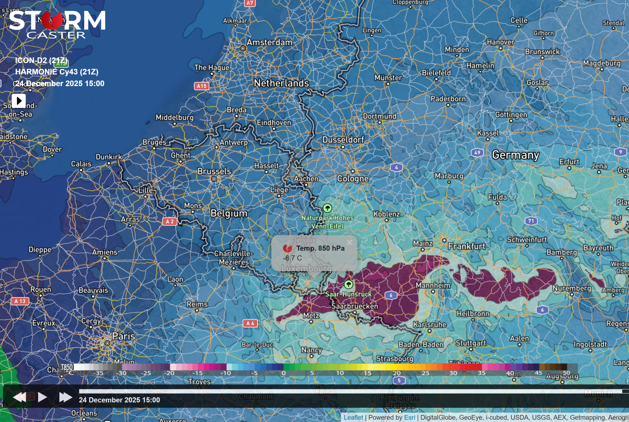 Zo trekt onder meer een 'koude bel' volgens de laatste uitdraai (21Z) van ICON-D2 vanuit het noordoosten van Europa richting het midden van Duitsland, dan richting het zuidoosten van België en Luxemburg en voorts richting het midden van Frankrijk. Op de kaarten van 500 hPa is die 'koude bel' goed te zien en trouwens ook wel op 850 hPa. De temperaruren op ongeveer 5,5 km (500 hPa) zakken woendagmiddag op die hoogte tot beneden de -30 graden, op zo'n 1500 meter hoogte in Luxemburg tot beneden de -8 graden. Iets richting zuiden tot beneden de -10. Volgens de berekeningen dan hè?