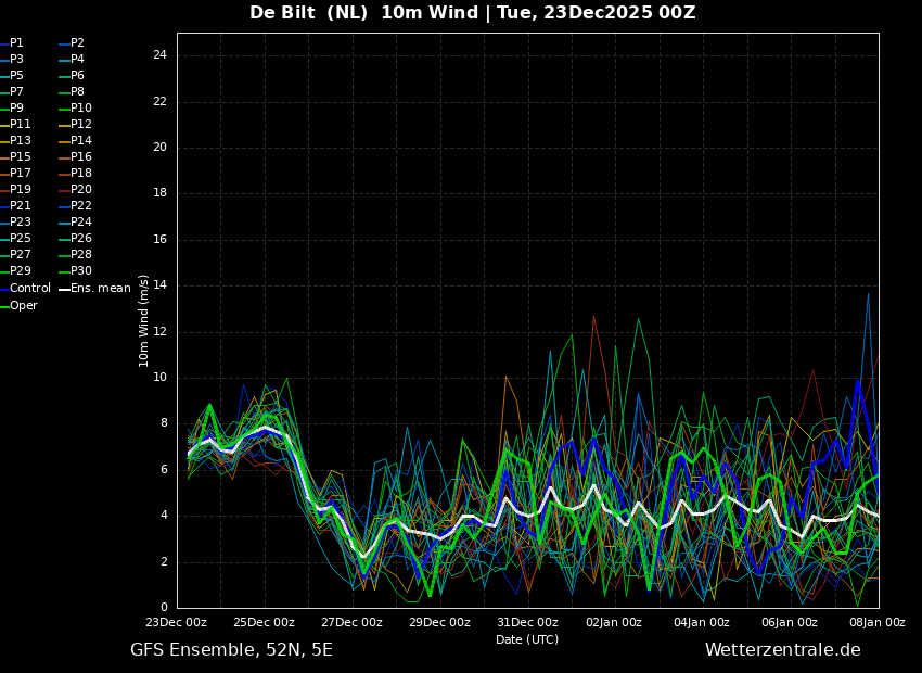 Ook voor zondag, maandag en dinsdag is dat de range waarin de maxima zich begeven, maar dan zie je de spreiding al toenemen.