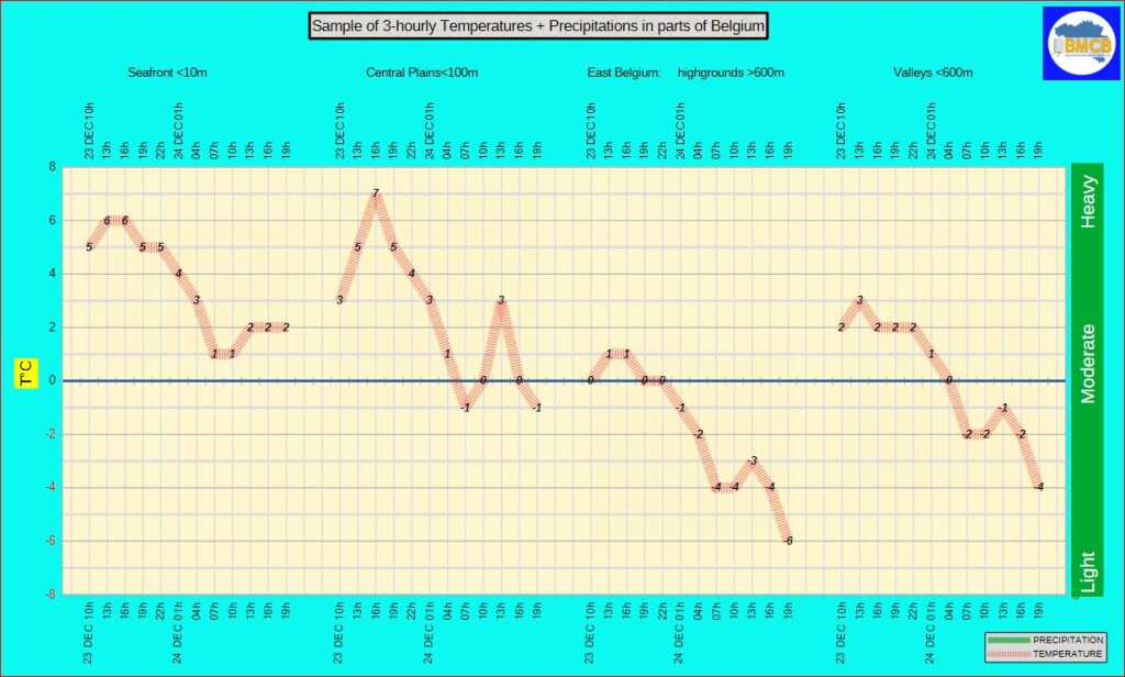 Maximumtemperaturen : rond 6°C aan zee, 4 tot 7°C in het binnenland en 1 tot 3°C in de Hoge Ardennen.
