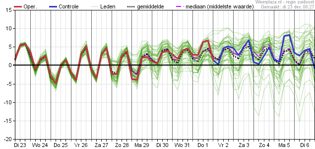 Hoe verder van zee, hoe meer kans op het aanhouden van lichtwinters kwakkelweer. Een paar dappere lijntjes gaan zelfs richting -15.