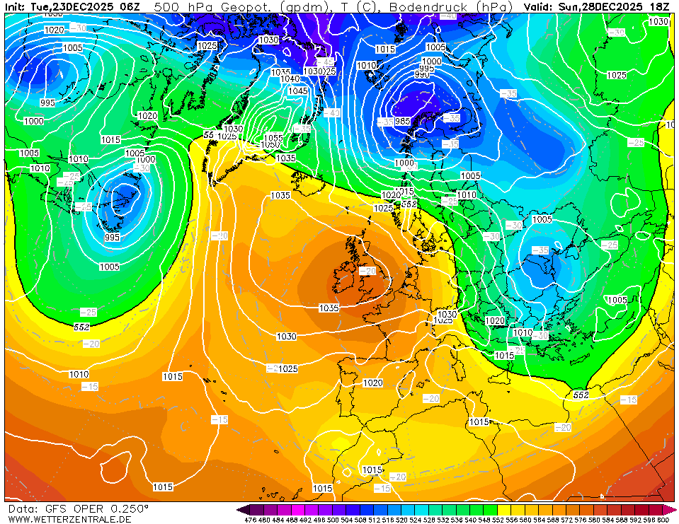 Geen kansloze setting. De blokkade is groot op de Oceaan en de lagedruk zet vanuit het westen weinig druk meer. Je zou zeggen dat vroeg of laat de koude lucht vanuit het noorden naar beneden kan komen met kans op sneeuwbuien. Het vervelende is dat er nog een lange weg is af te leggen. Het komt dus neer op de wachtkamer die voorlopig nog lang kan zijn.