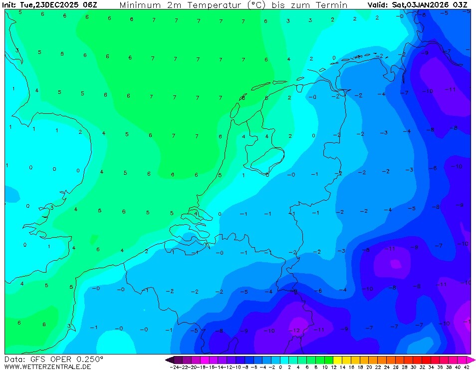 Tx / Tn overzicht (06z GFS oper, 23 december 2025)