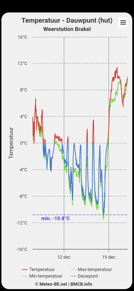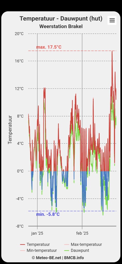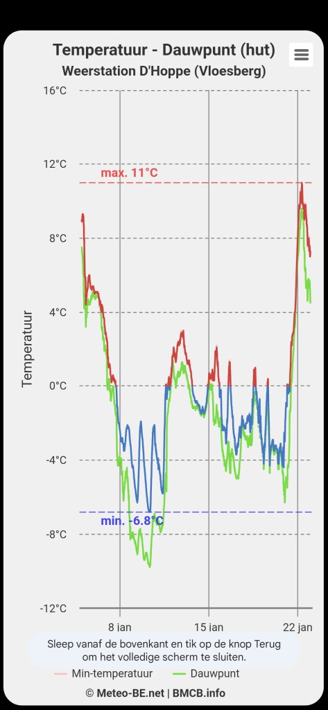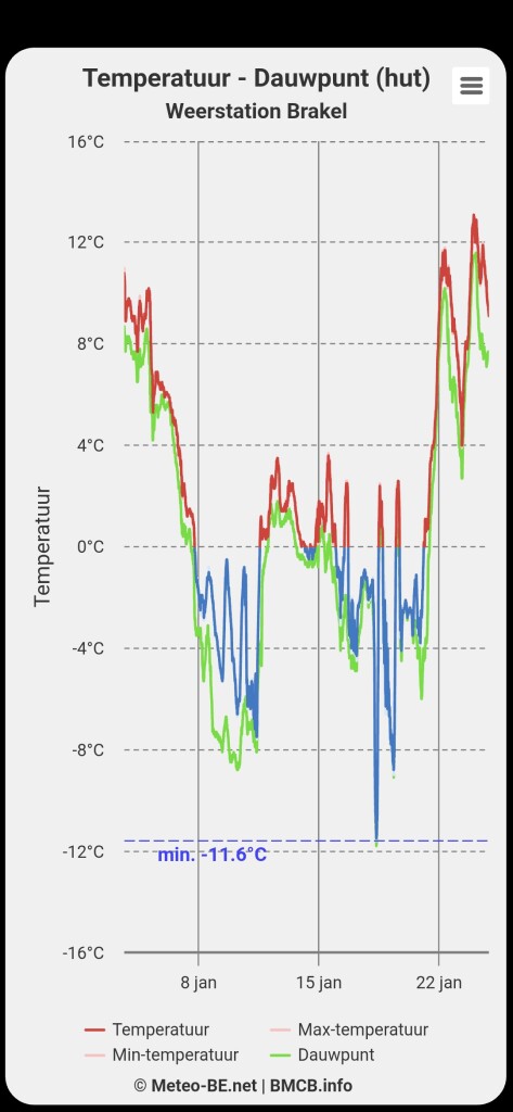 Bijgevoegd enkele grafieken uit winter 22-23, 23-24 en 24-25. Wat de laatste winter betreft geen echt koude periodes, maar wel veel nachten met duidelijke nachtvorst. Ochtenden met rijpvorming, met witte bomen, met laagjes ijs. En ook die kunnen prachtig winters zijn. Dat laatste staat overigens los van een periode met totaalwinter zoals we zeker vroeger gekend hebben, en wat velen onder ons wensen.
