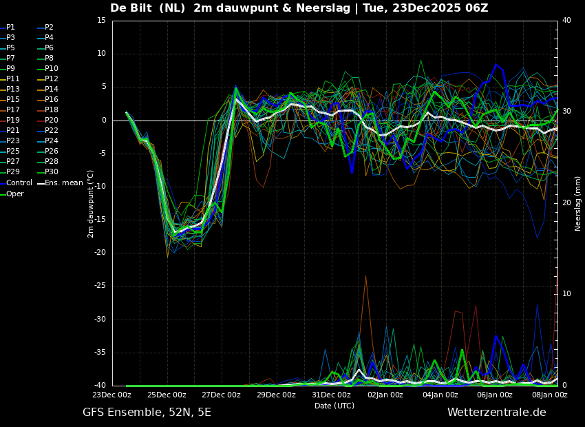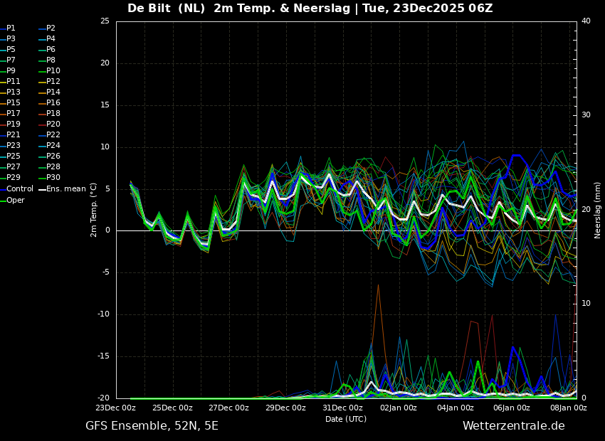 Begin volgend jaar zakt de temperatuur weer wat terug naar zo'n 4 graden, waarbij er rond 3 en 4 januari zelfs een bifurcatie zichtbaar lijkt te zijn.
