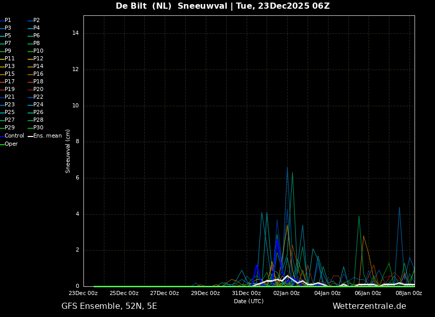 Neerslagkansen zijn er voorlopig niet en als deze zich weer aandienen (zo rond 30 december) dan is de kans aanwezig dat dit ook in de vorm van sneeuw kan zijn.
