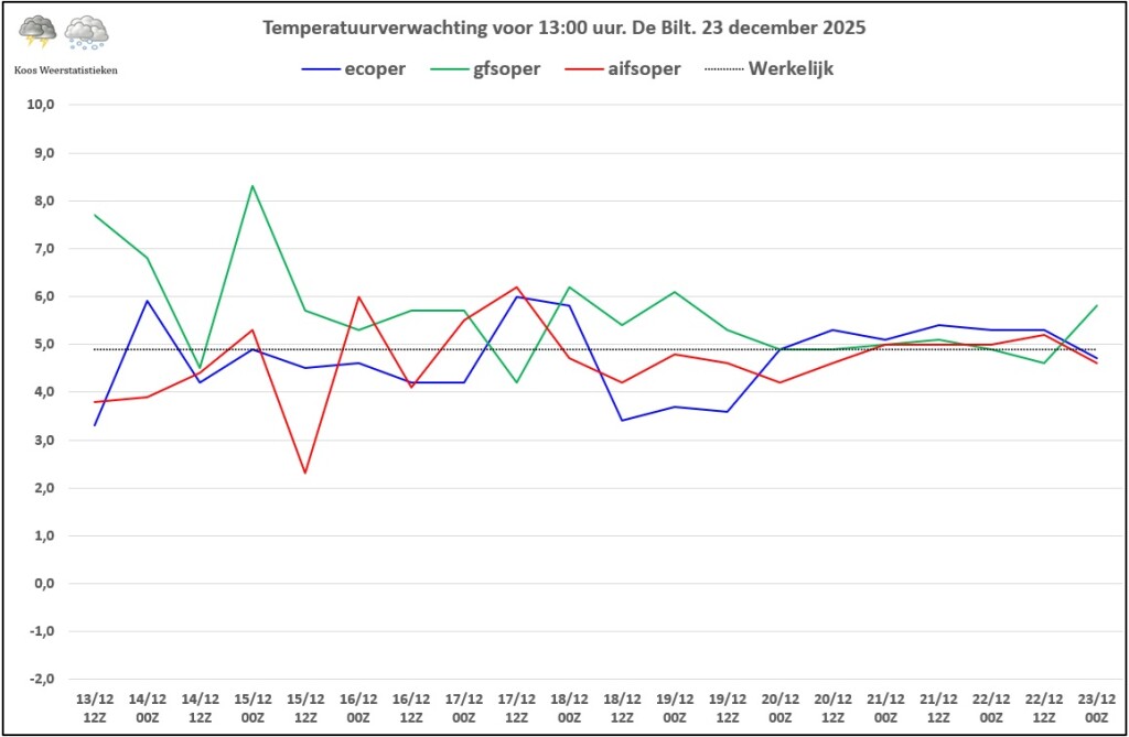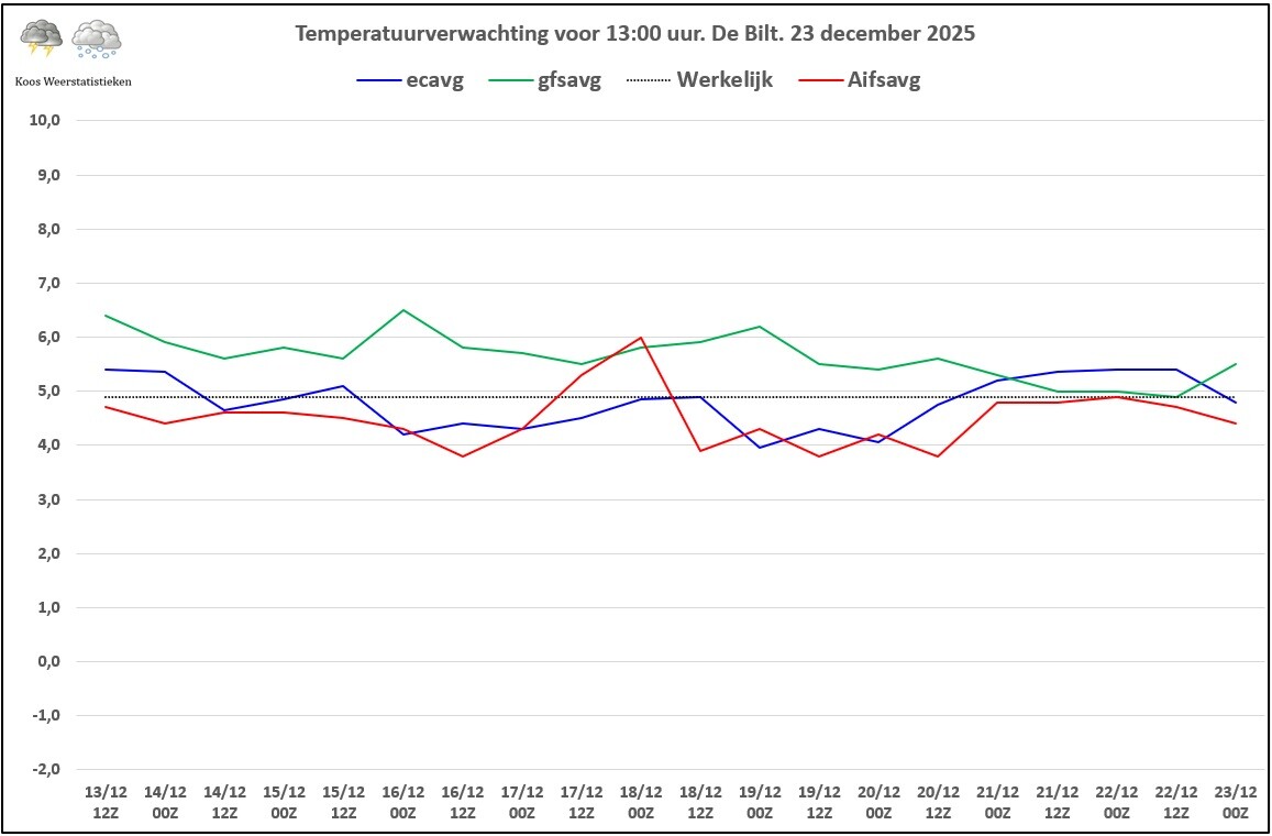 Temperatuurverwachting om 13:00 uur de komende dagen.