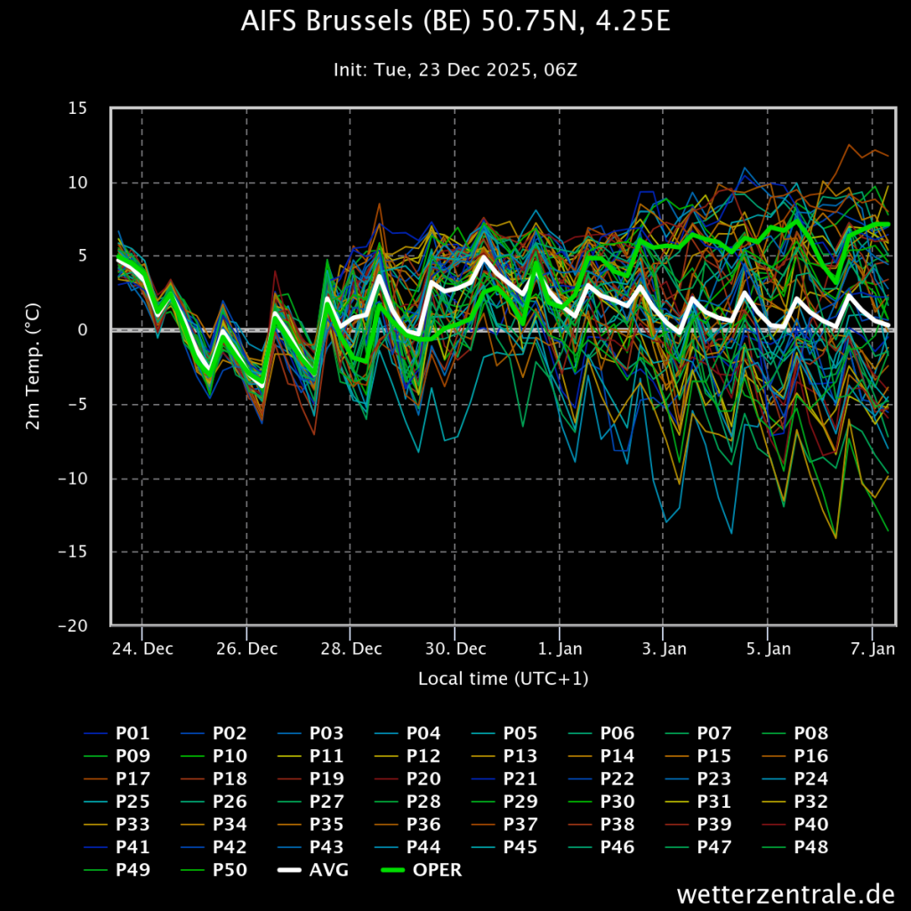 Loopt nu weer goed op WZ. Oper AIFS zit vanaf 01/01 bovenin. Over de ganse linie blijft het gemiddelde onder normaal en daalt weer richting licht winterse temperaturen begin januari, na een korte opleving op 30/12 en 31/12. Maar ook hier zien de enorme spreiding toenemen begin januari.