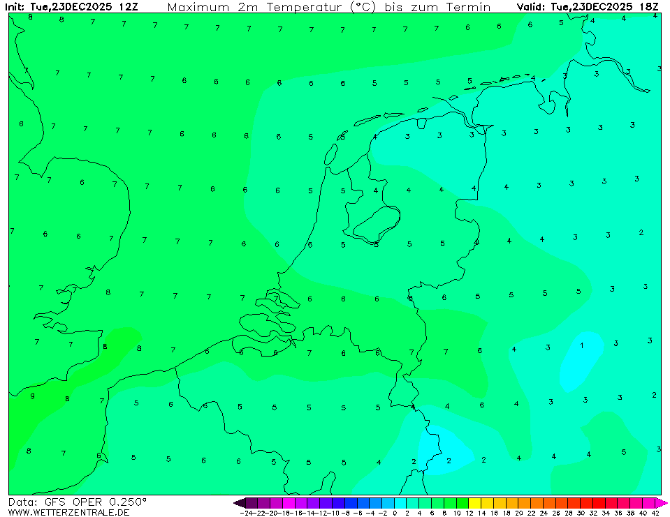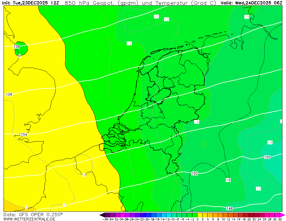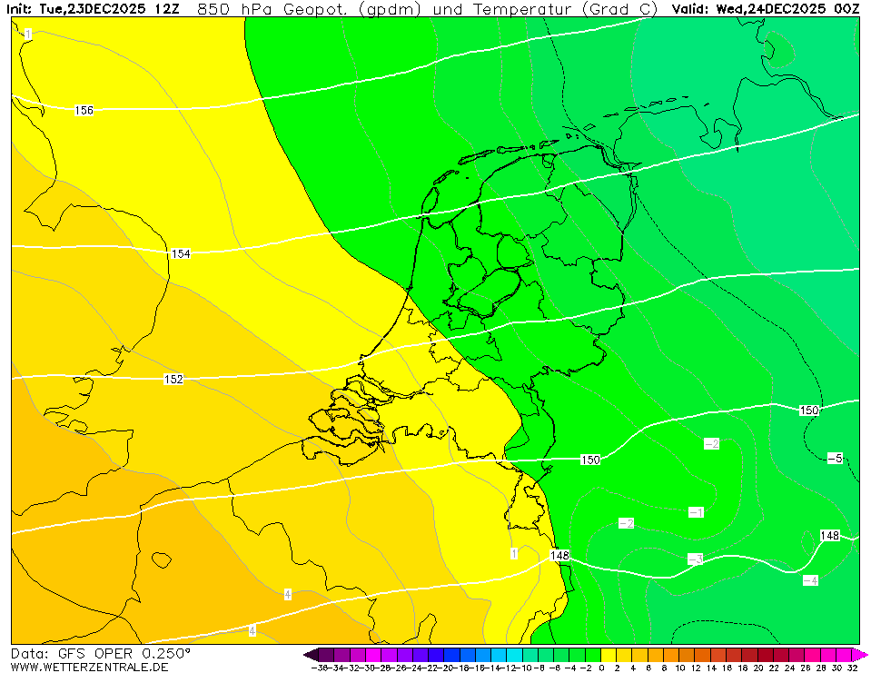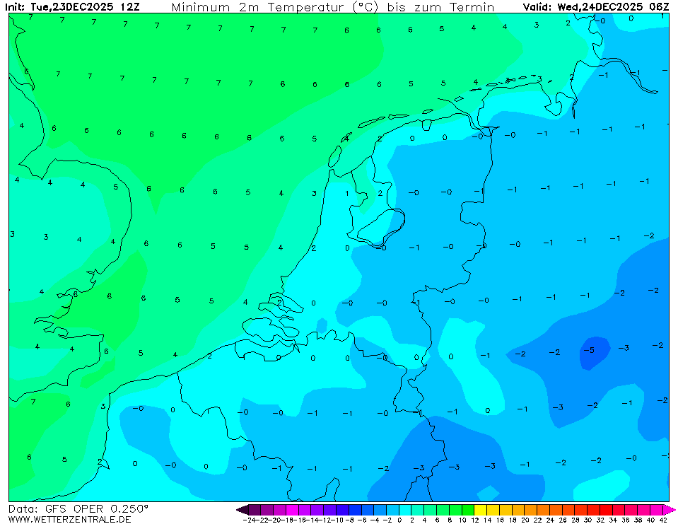 Stap voor stap verlaat de warmste bovenlucht Nederland echter wel. Opklaringen vanuit het noordoosten winnen geleidelijk terrein, waardoor het kwik pas laat in de nacht richting het vriespunt zakt, zoals het onderstaande GFS-model laat zien.