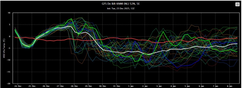 Op het 850 hPa vlak ligt de temperatuur vanaf 30 december vaak onder het langjarig gemiddelde.