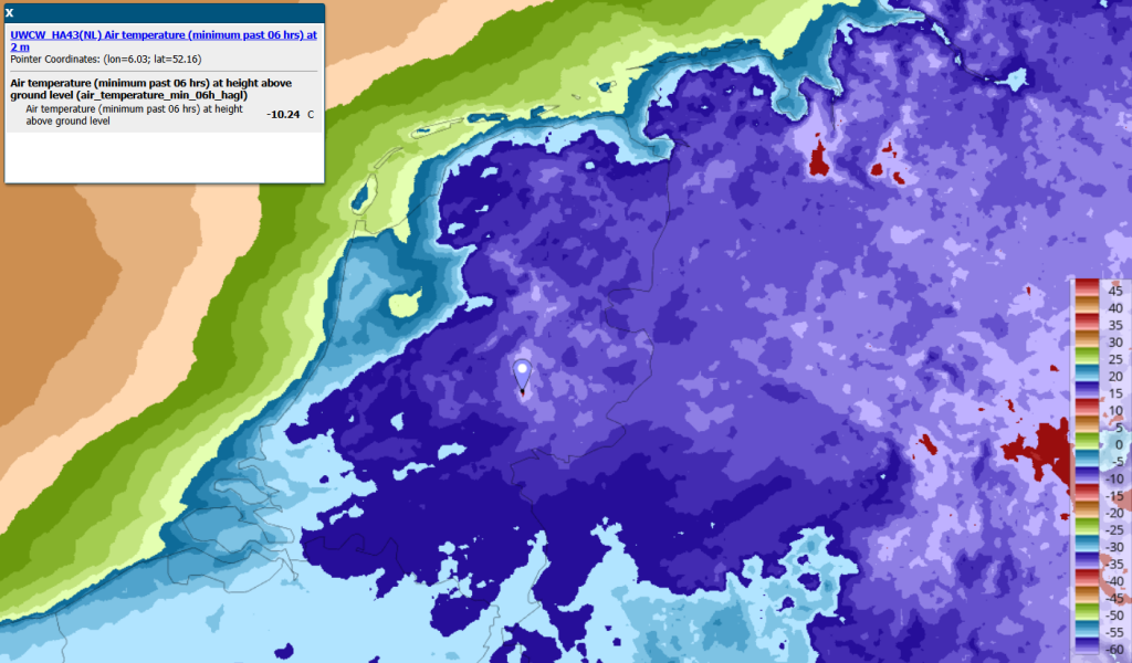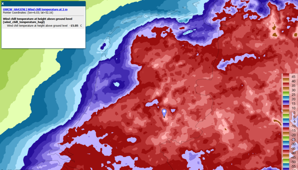In de nacht naar vrijdag, Tweede Kerstdag, gaat het volgens de 16 UTC run van HA43 op grote schaal matig vriezen. Op de Veluwe zou het, als het aan het model ligt, zeer lokaal streng kunnen vriezen door stralingskoude. De gevoelstemperatuur zal daarnaast op veel plekken tussen de -10°C en -14°C liggen. Dit is overigens voor 04 UTC, dus tegen het einde van de ochtend kan de temperatuur nog iets lager uitkomen.