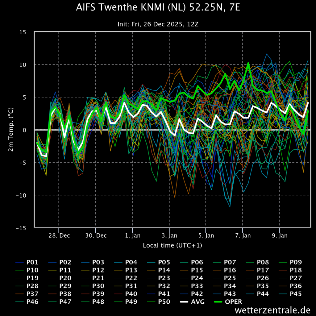 Een bifurcatie is meer een opsplitsing in 2 soorten oplossingen. Deze grafiek toont slechts een grote spreiding in oplossingen vanaf het nieuwe jaar. Een bifurcatie kan ik hierin niet ontwaren. Behalve misschien: Het kan vriezen of dooien