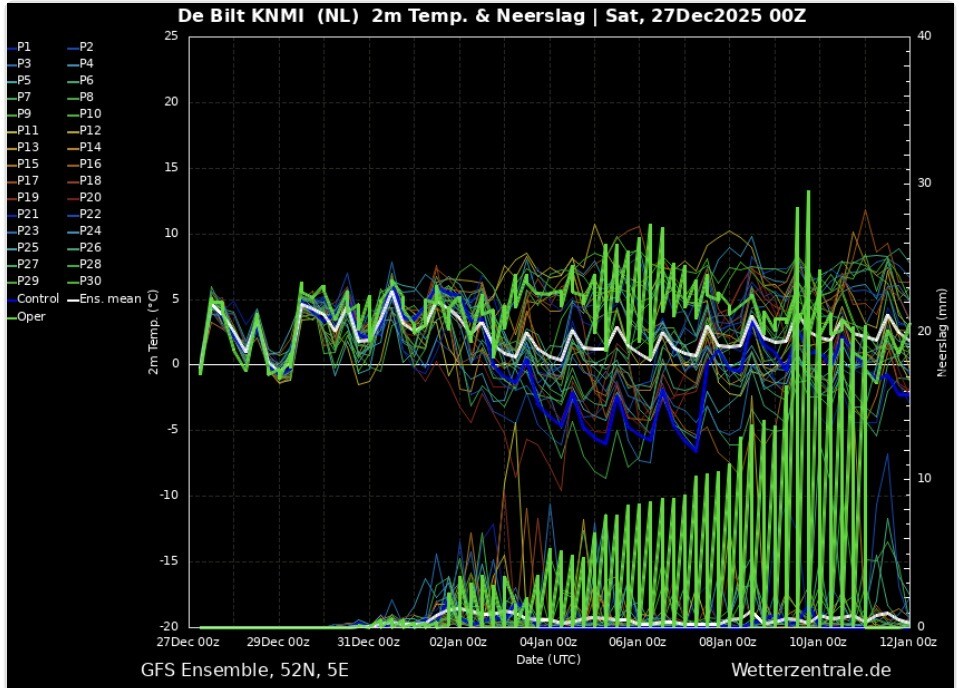 Het ensemble van GFS is slecht te lezen door die gekke oper. Ik vind m in ieder geval wel grappig met die neerslag die telkens een tandje oploopt