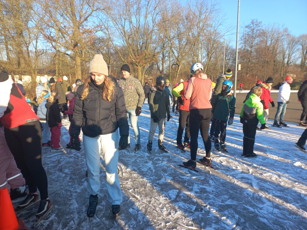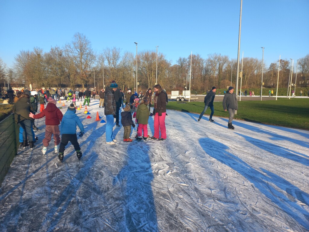 Het was wel te merken dat het vakantietijd is, met al dat kleine grut op de baan. Vaak stoelen voor zich uit duwend voor de balans. Ook ouders met kinderwagens en een enkele schaatsstep die de aandacht trok. Vanmorgen hetzelfde verhaal, maar dan zonloos met nog steeds vriezend weer. Het ijs was duidelijk dikker dan de dag ervoor. En weer net zo druk als gisteren, met bij velen in het achterhoofd de wetenschap dat het voorlopig wel weer de laatste dag kan zijn geweest.