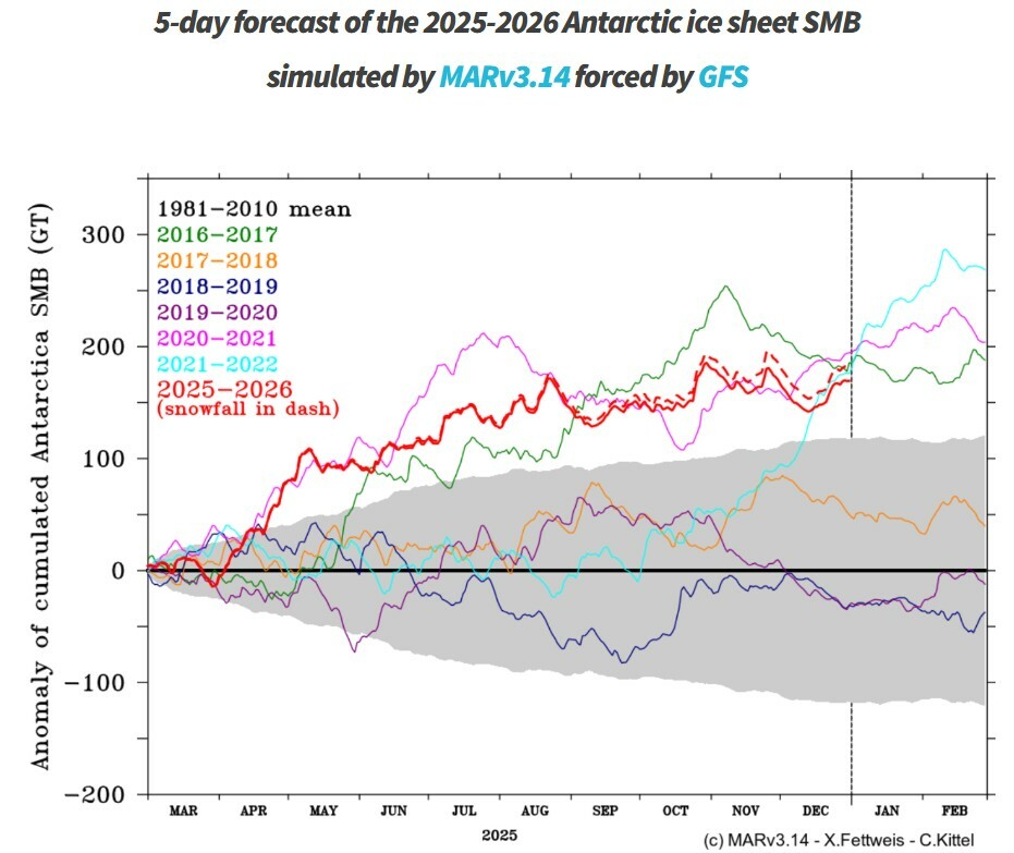 Er zijn nieuwe gegevens van de berekende Surface Mass Balance (SMB) van Antarctica voor het seizoen 25-26. Opnieuw is de SMB ver boven normaal, nu ongeveer 150 Gigaton. De grootste afwijking is ontstaan tussen maart en juli.