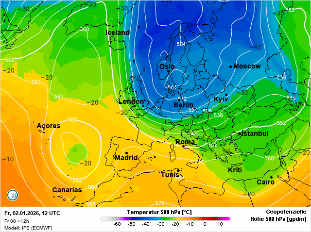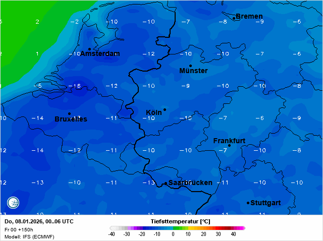 Op de weerkaart zien we een bel ontsnapte poollucht die zich uitstrekt via de Noordelijke IJszee tot over de Britse Eilanden en de Noordzee. Dankzij de sterke wind vanaf de Noordzee wordt de enorme kou wat hogerop niet vertaalt aan de grond. Op 5 km hoogte is de temperatuur gedaald naar ruim -40 graden en in Lapland, alwaar het lokaal voorbije nacht ruim 40 graden vroor zelfs tot ruim -45 graden.