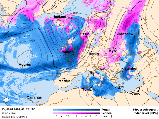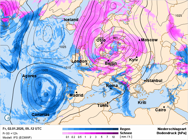 De nacht naar woensdag in het zuidoosten matige vorst. Naar het westen toe wordt de vorst getemperd door een interessante ontwikkeling. Een kleine randstoring trekt langzaam vanuit het westen ons land binnen wat gepaard gaat met sneeuw die zich in de ochtend langzaam over het land uitbreid. Of het uiterste oosten ook bereikt wordt is onzeker. Op meer plaatsen draait het uit op een ijsdag met maxima die op sommige plaatsen wel eens enkele graden onder het nulpunt kunnen blijven schommelen. In de nacht lijkt het te gaan opklaren. het gaat op veel plaatsen matig vriezen en daar waar zich een sneeuwdek heeft gevormd kan het kwik zelfs op avontuur gaan richting strenge vorst met minima dalend tot beneden de -10 graden.