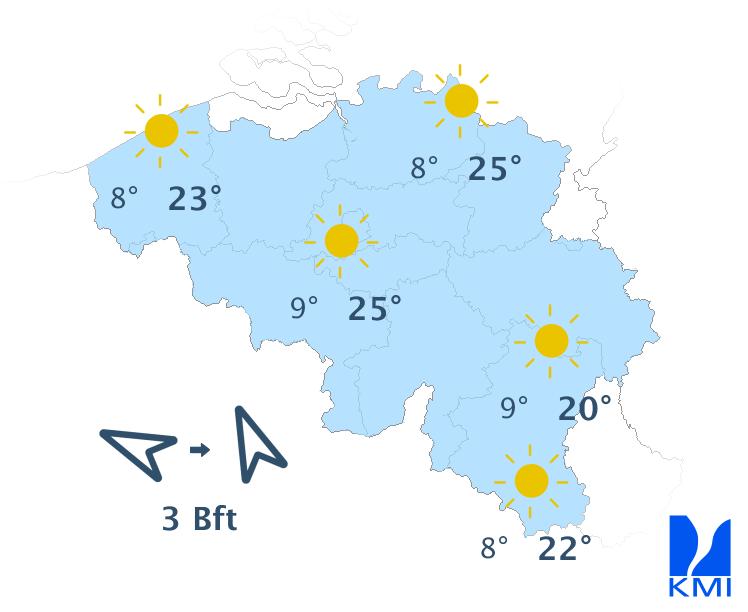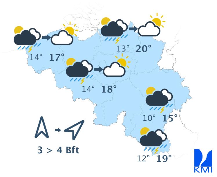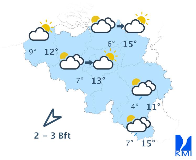 Deze namiddag zijn er brede opklaringen met eerst nog wat meer wolken en kans op een sneeuwbui over het oosten van het land. Tegen vanavond neemt de bewolking aan de Kust alweer toe vanaf het westen op nadering van een sneeuwzone. De maxima schommelen tussen -2 graden in de Hoge Venen, 0 of +1 graden in het centrum en +3 graden aan zee. De wind waait in het binnenland zwak tot soms matig uit westzuidwest. Aan zee waait er een matige westenwind die tegen de avond krimpt naar zuidwest tot zuidzuidwest.