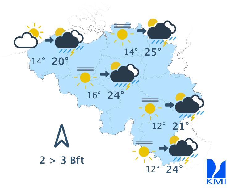 Woensdag trekt de sneeuwzone van west naar oost door het land waaruit op de meeste plaatsen enkele centimeter verse sneeuw kan vallen. Het zal op veel plaatsen dus glad zijn. In de ochtend is dat overigens ook het geval door ijsplekken, vooral over het centrum en oosten van het land. Na doortocht van de sneeuwzone wordt het grotendeels droog vanuit het westen maar hangen er nog veel lage wolken. In het westen zijn uiteindelijk enkele opklaringen mogelijk. Een winterse bui is nog mogelijk maar naarmate de namiddag vordert neemt de kans gestaag af. De maxima schommelen van 4 à 5 graden aan zee, 1 graad in het centrum rond -4 à -5 graden in de Hoge Venen. Er staat een matige tot soms vrij krachtige, aan zee krachtige, zuidzuidwestenwind die na doortocht van de storing ruimt naar het zuidwesten en aan zee naar het westen. Er zijn tijdelijk rukwinden mogelijk rond 60 tot lokaal 65 km/h.