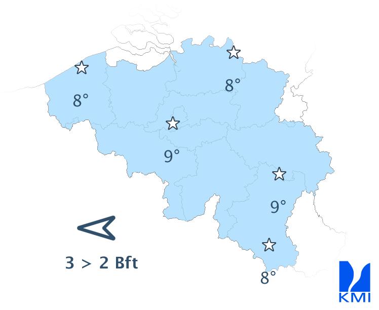 Vanavond neemt de bewolking verder toe vanaf de Kust. In het centrum en zeker in de oostelijke landshelft zijn er eerst nog brede opklaringen. Vooral daar is het uitkijken voor gladheid door gevallen sneeuw en bevriezing van natte weggedeelten. Ook elders kan het lokaal glad zijn om bovengenoemde redenen. Uiteindelijk wordt het overal betrokken en we verwachten de eerste sneeuw over het westen op het einde van de nacht en in de ochtend. Uiteraard zorgt deze verse sneeuw voor extra gladheid. De minima worden in de avond bereikt en schommelen rond het vriespunt aan zee, rond -2 graden in het centrum en tot -8 graden in de Hoge Venen. In het uiterste westen komt het kwik in de loop van de nacht licht boven het vriespunt maar verderop in het binnenland blijft het vriezen. De zuidzuidwestenwind wakkert aan en wordt overal matig en aan zee vrij krachtig. Er zijn rukwinden mogelijk tot zo'n 55 km/h over het uiterste westen.