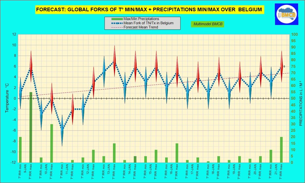 Neerslag (24u): 20 tot 55 L/m² Temperaturen: minima -2 tot +4°C | maxima 3 tot 9°C