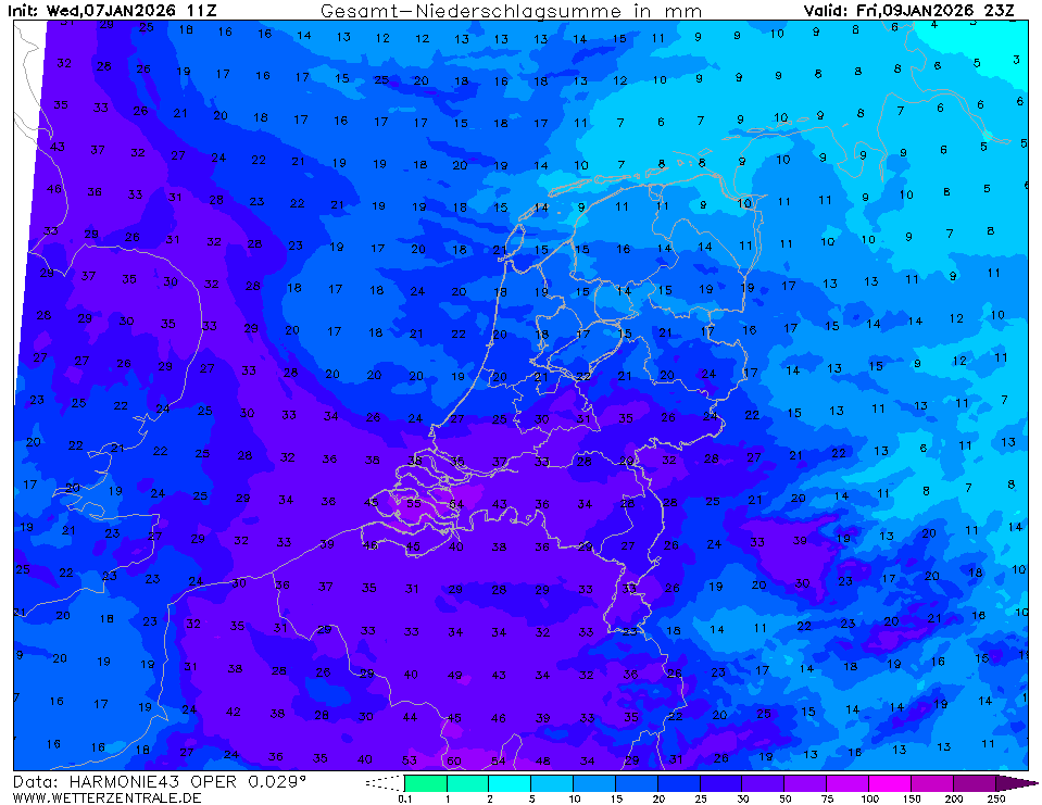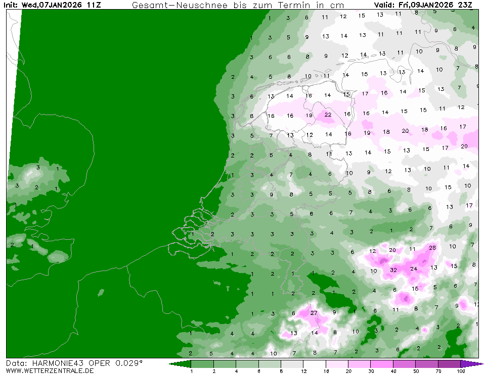 Dit gaat het sneeuwdek niet overleven. Andere modellen komen eveneens met dergelijke hoeveelheden maar dan boven Vlaanderen (afhankelijk van de positie van de kern). Voor het noordoosten staat 10-15 mm ingetekend maar de sneeuwvalsom laat 15-20 cm zien. Hoe kan dat?