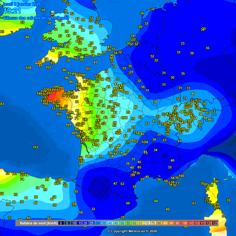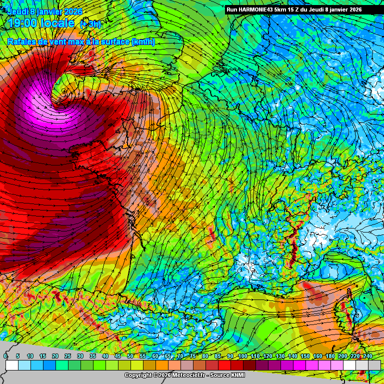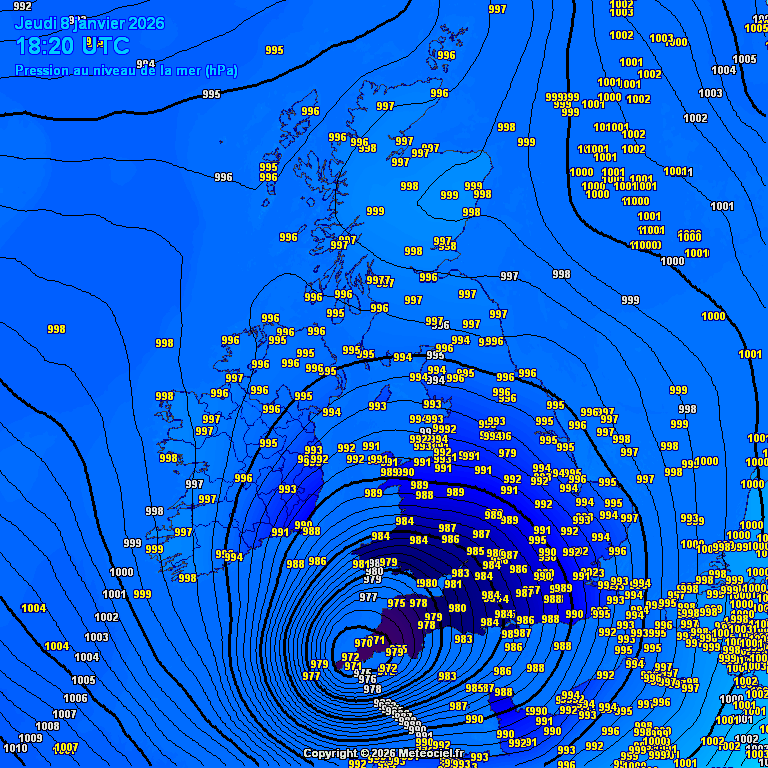 Deze eilanden voor de kust van ZW Engeland pakken het volle windveld mee. Kerndruk is momenteel 970 hPa.