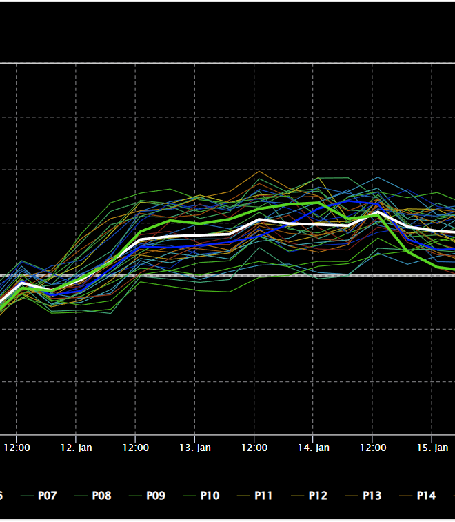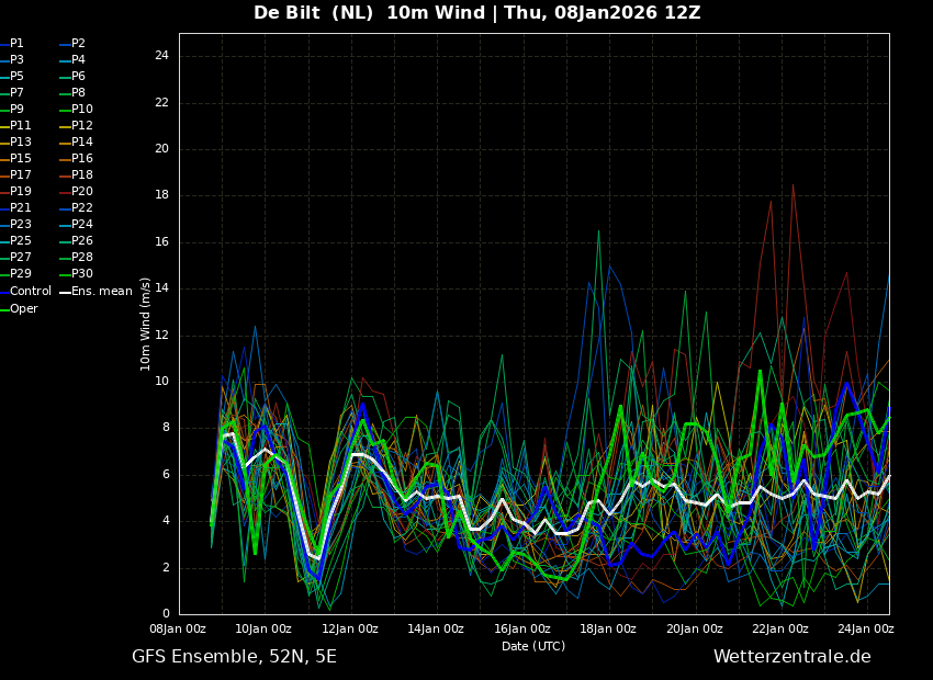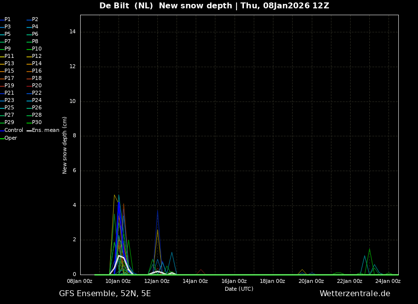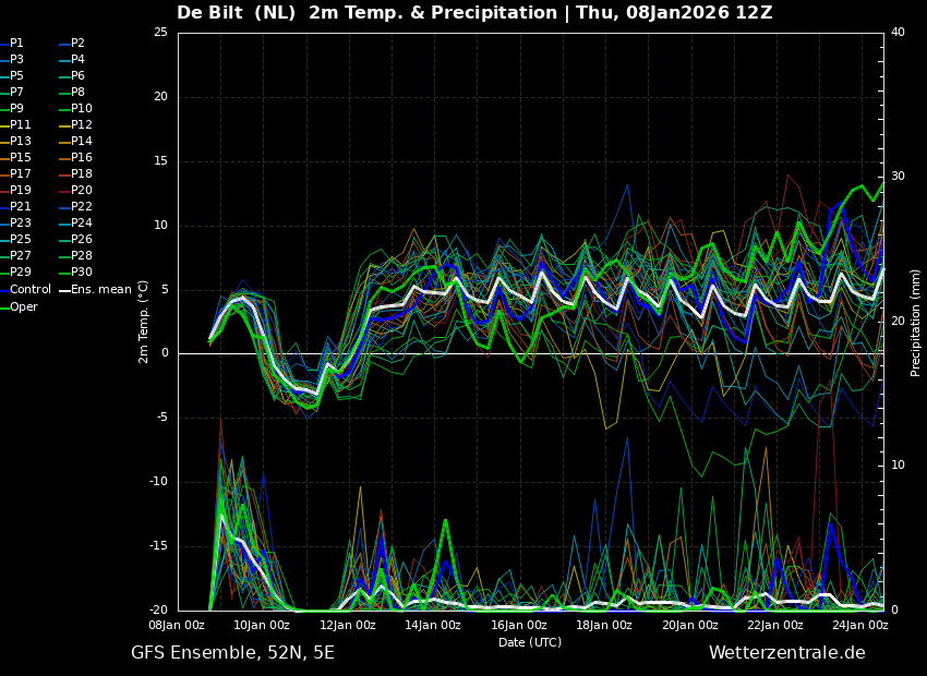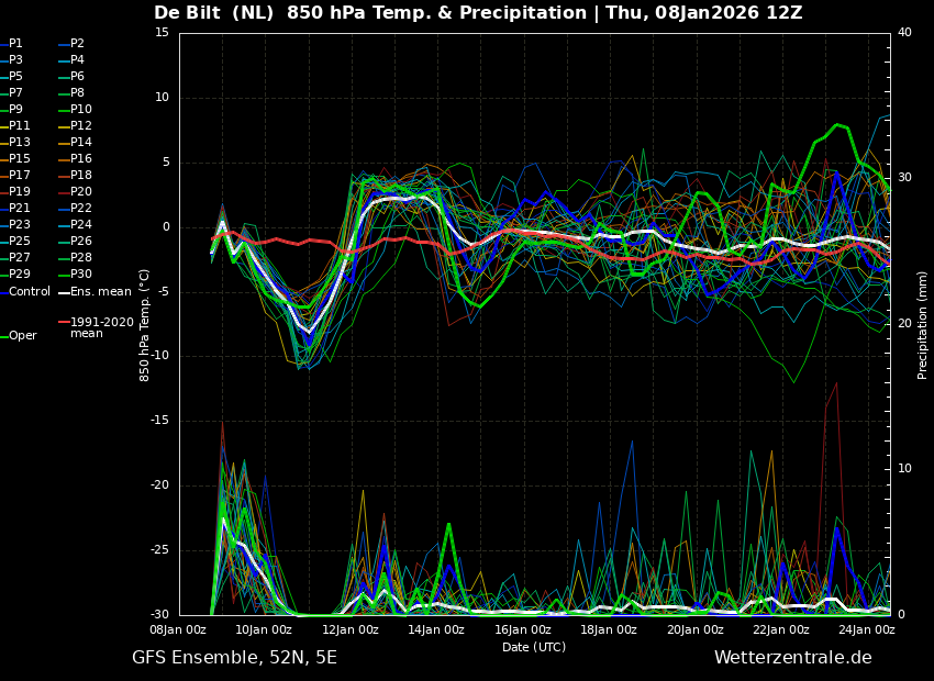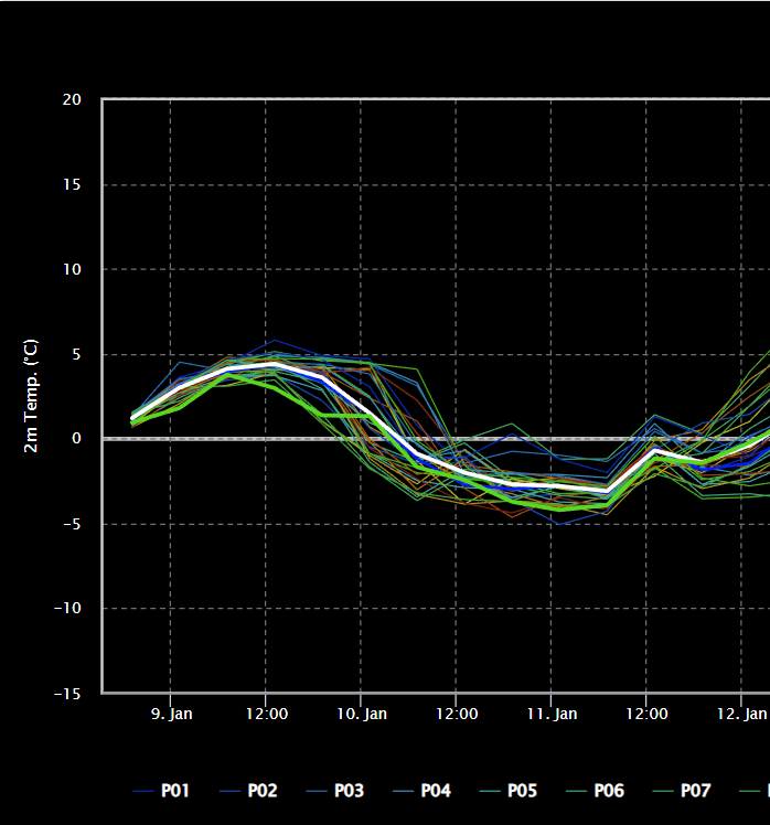 Hierdoor valt de maximum temperatuur voor zaterdag dus kort na middernacht (volgens het gemiddelde is het dan 1 a 2 graden, maar een klein deel van de leden laat het langer zacht blijven, terwijl een meerderheid van de leden juist een snellere afkoeling laat zien (zie 6e afbeelding onder dit bericht)), terwijl de minimum temperatuur pas vlak voor middernacht op zaterdagavond valt en volgens het gemiddelde rond de -3 graden zal liggen.