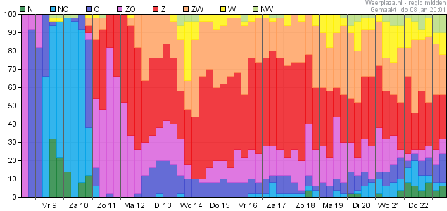 Op veel dagen heeft het overgrote deel van de leden een zuidcomponent in de windrichting.