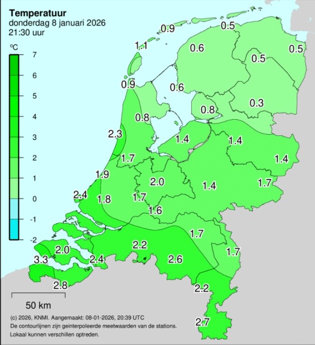 Was die hier eerst gedaald naar 1.4 graden met de regen, inmiddels loopt die weer geleidelijk op door komst van tijdelijk zachtere lucht.