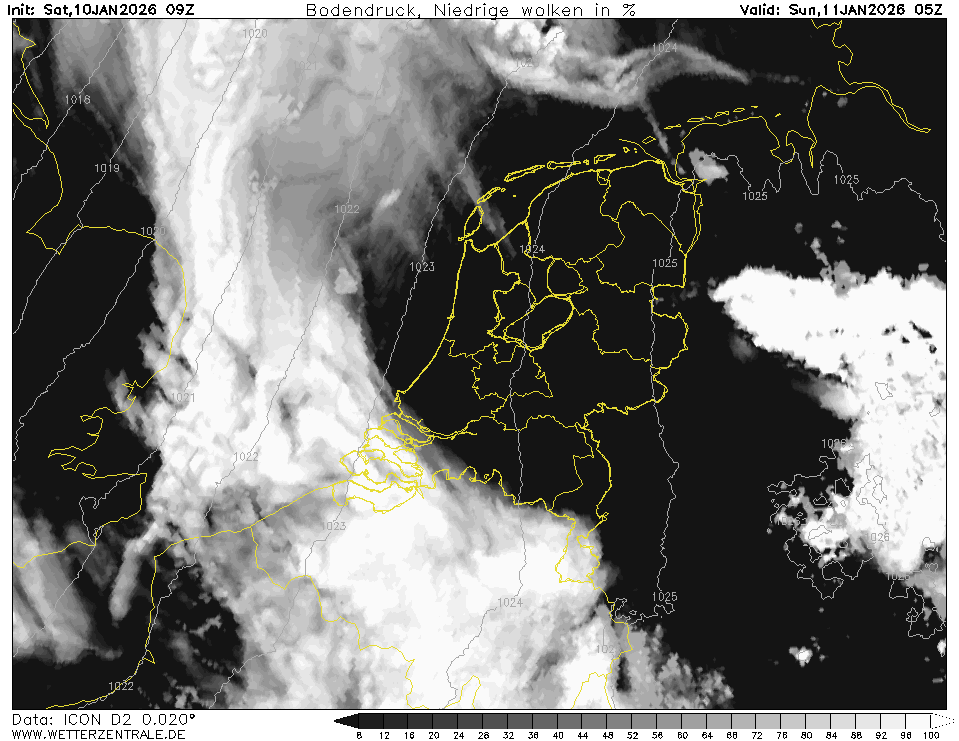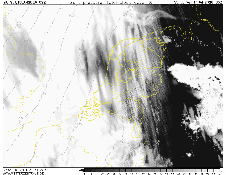 ICON-D2 voorziet de nodige bewolking. Voornamelijk over Belgie en zuidwest Nederland. Hoge bewolking en stratus.