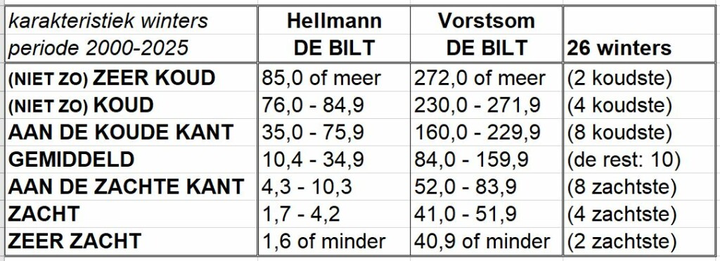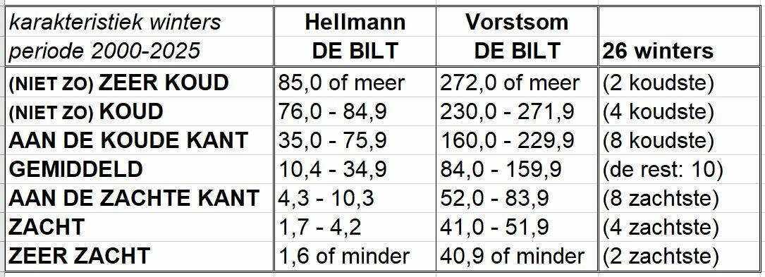 Eerste kerstdag was het zonnig en hadden we hier een ijsdag. Maar dat was buiten aan niets te zien. Het had net zo goed +8 graden en zonnig kunnen zijn. Maar op 2 en 3 januari is de temperatuur hier geen moment onder nul geweest, maar was het buiten een prachtig winters landschap, vanwege de vele sneeuw. Qua kouproductie heeft deze winter nog niet geweldig gepresteerd, als zoveel winters de laatste tientallen jaren trouwens. Daarom is dat tabelletje van het KNMI eigenlijk niet meer van deze tijd. Stel dat een winter 98 Hellmannpunten scoort. Dan is deze volgens het KNMI nog steeds 'mild'? Het zou één van de koudste winters van de 21e eeuw kunnen zijn! Vergelijk deze twee staatjes maar eens die ik heb gemaakt. Het overzicht van de winters van de 20e eeuw en die van deze eeuw.