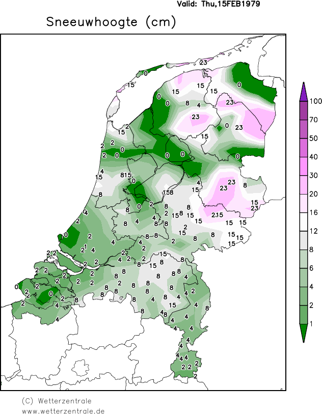 Zeker: bij weergegevens.nl, die doorgelinkt wordt naar Wetterzentrale. Er waren in die tijd wel nog maar een paar codes voor sneeuwhoogtes. Die zie je aangeduid als 2, 4, 8, 15 en 23 centimeter. Maar zulke kaarten geven toch wel een idee.