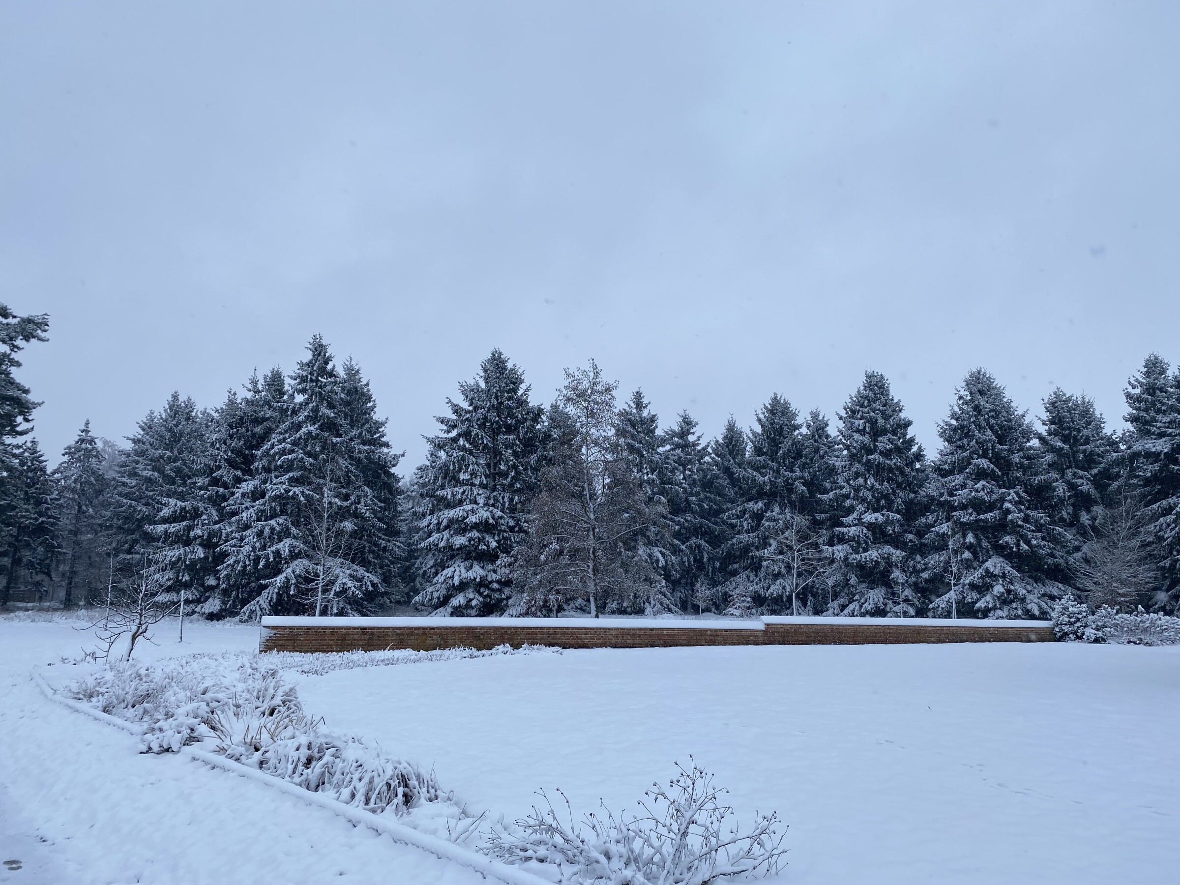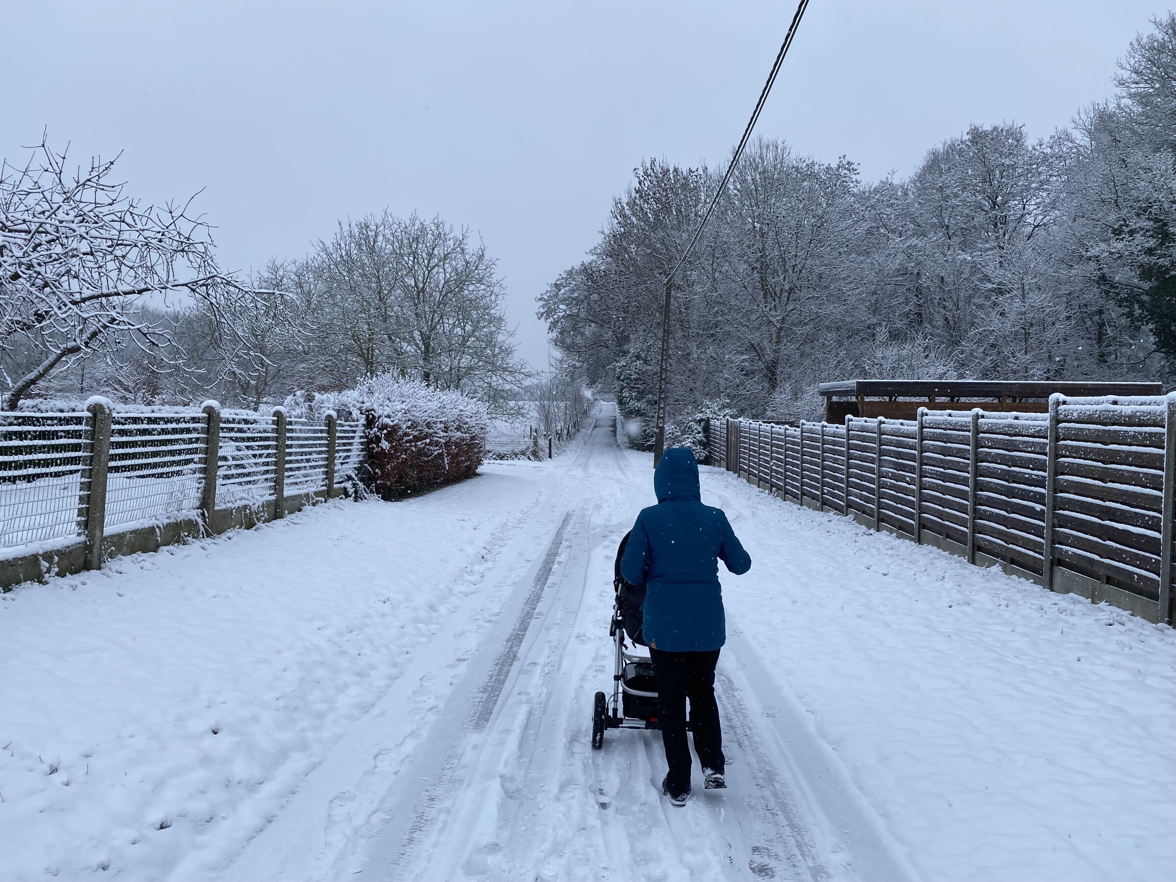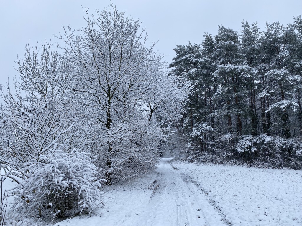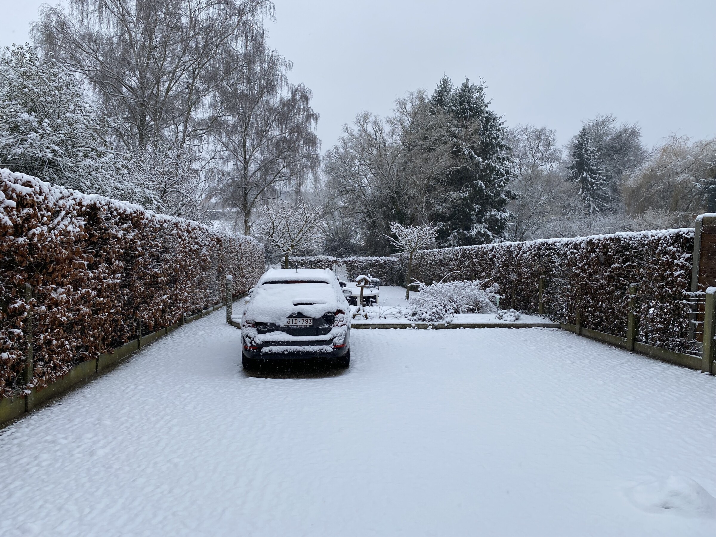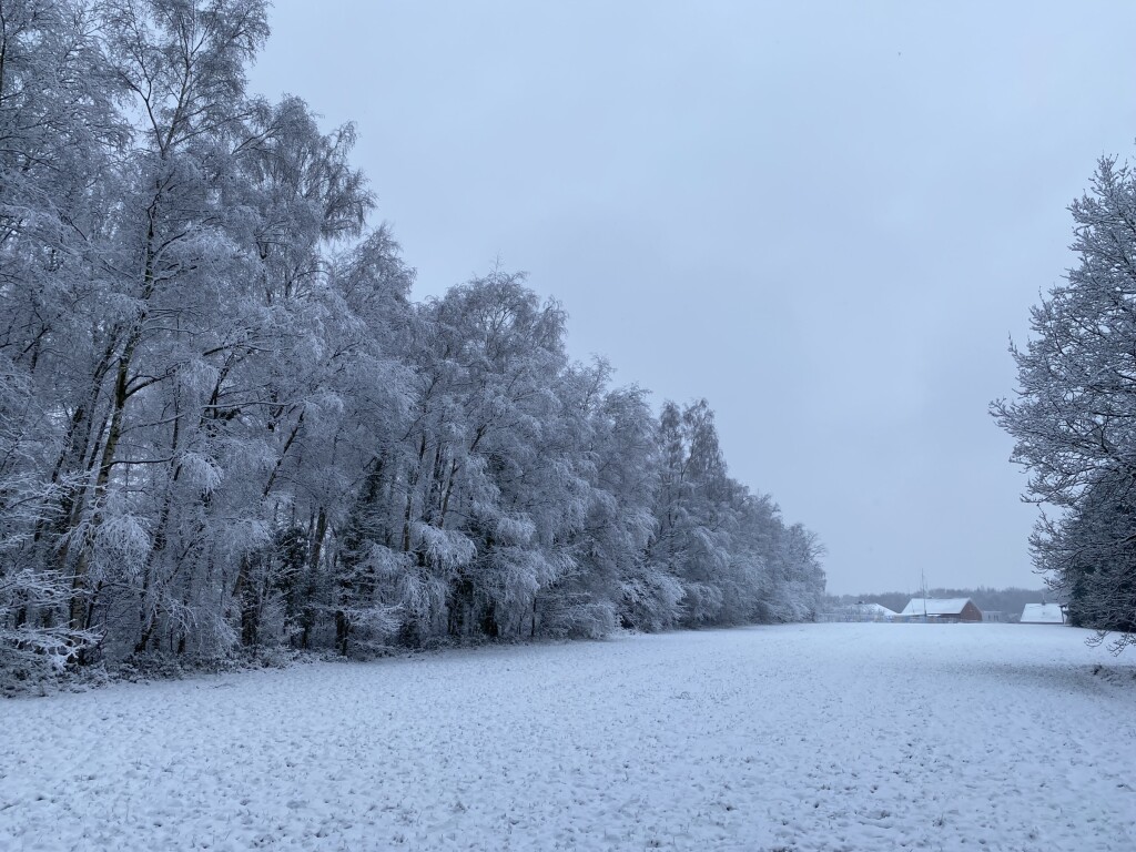 De nasleep van storm Goretti deed hier wat bij al de eerdere kansen niet lukte. Na 10 mm regen donderdagavond en 30 mm gisteren , ging de neerslag gisterenavond over in natte sneeuw en daarna sneeuw. Het bleef de ganse nacht en ook vandaag overdag licht sneeuwen. Omdat alles mooi bedekt is en er nog geen zon aan te pas kwam, is er een mooi winterwonderlandschap ontstaan. We hebben ervan geprofiteerd om een sneeuwwandeling te maken .