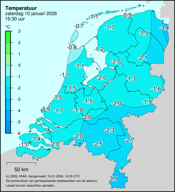 Om 15:30 -3.4°C in Nieuw-Beerta, terwijl het nog overdag is en er nog een vrij stevige wind staat. Als de wind vannacht wegvalt, dan is zeer strenge vorst mogelijk. De maximale temperatuur van vandaag was -1.2°C in Nieuw-Beerta.